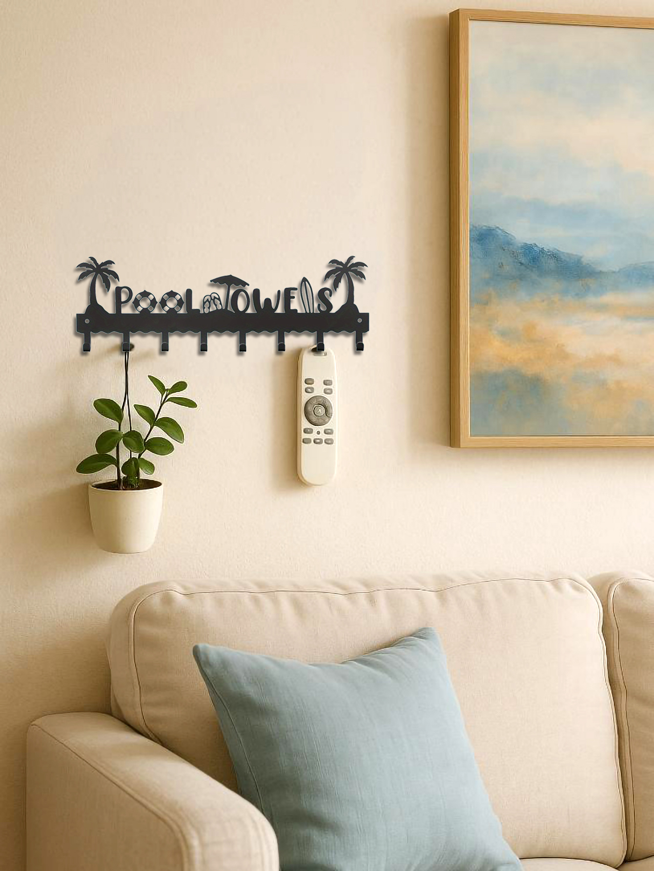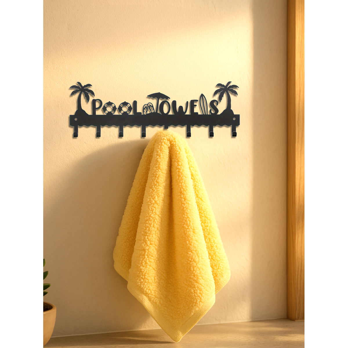 Beach-Themed Wall-Mounted Metal Towel Rack with 8 Hooks – Perfect for Pool Towels, Robes, Swimsuits, and More – Black Iron Design Featuring Palm Trees & Umbrella Silhouettes, Perfect for Room Decor
