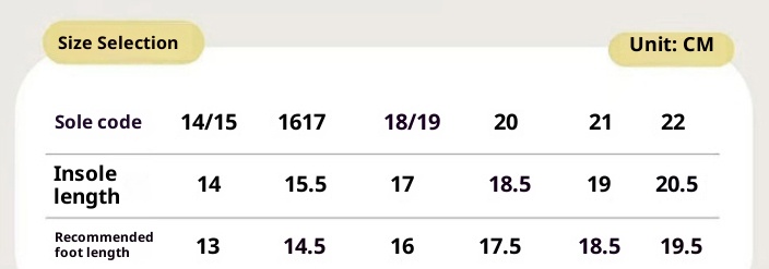 Size: 22/23 (Insole length 14cm fits foot length 13cm), 24/25 (Insole length 15cm fits foot length 14cm), 26/27 (Insole length 16cm fits foot length 15cm), 28/29 (Insole length 17cm fits foot length 16cm), 30/31 (Insole length 18cm fits foot length 17cm), 32/33 (Insole length 19cm fits foot length 18cm)