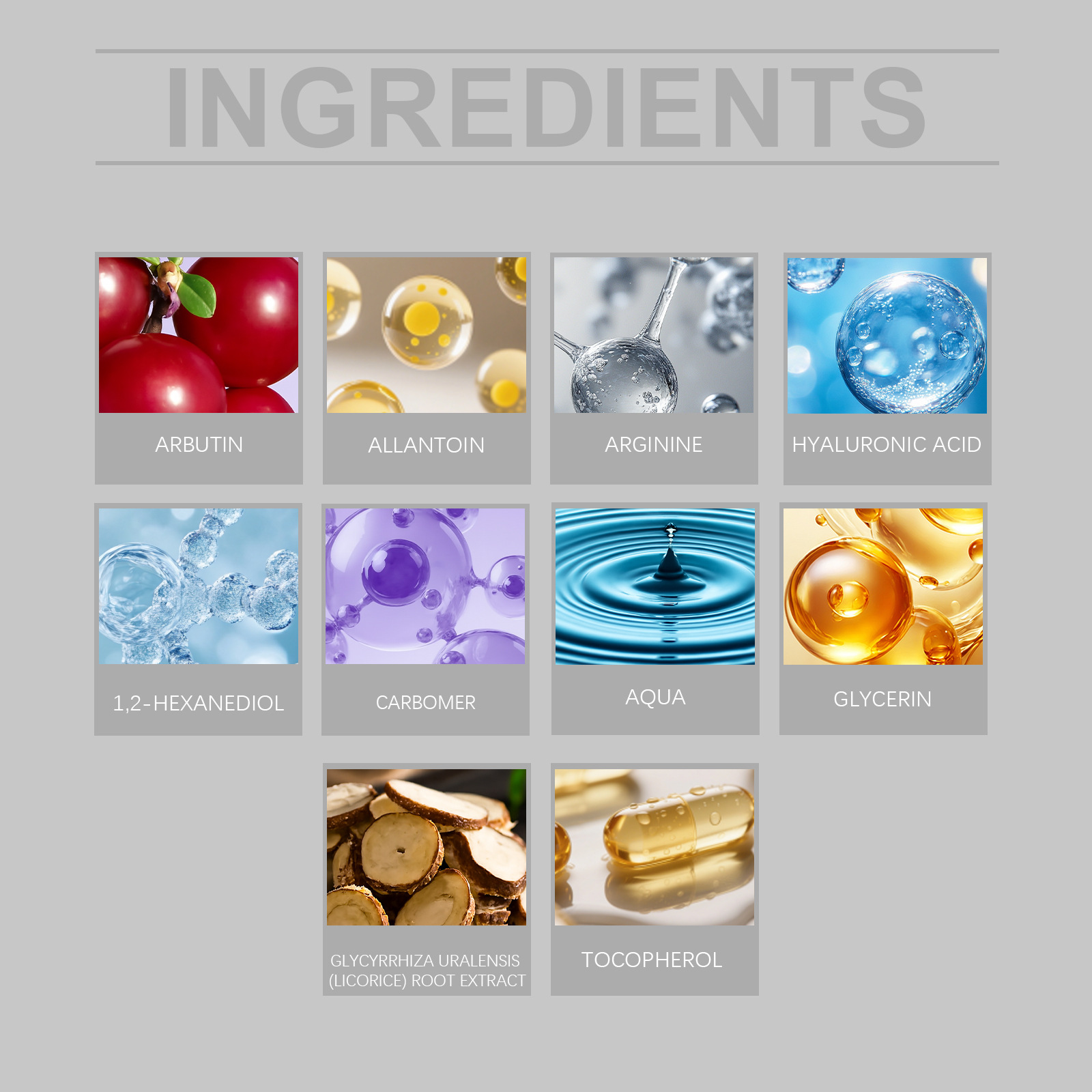 Ingredients: water, glycerin, 1,2- hexanediol, carbomer, arginine, allantoin, arbutin, licorice root extract, hyaluronic acid, tocopherol (vitamin E).