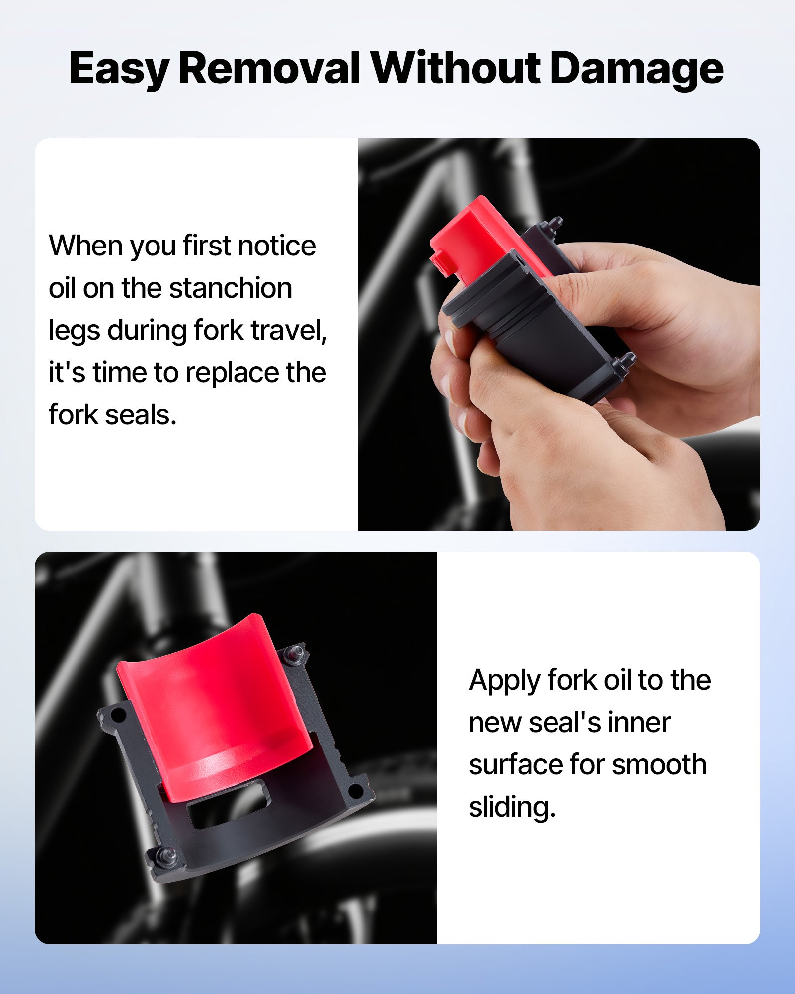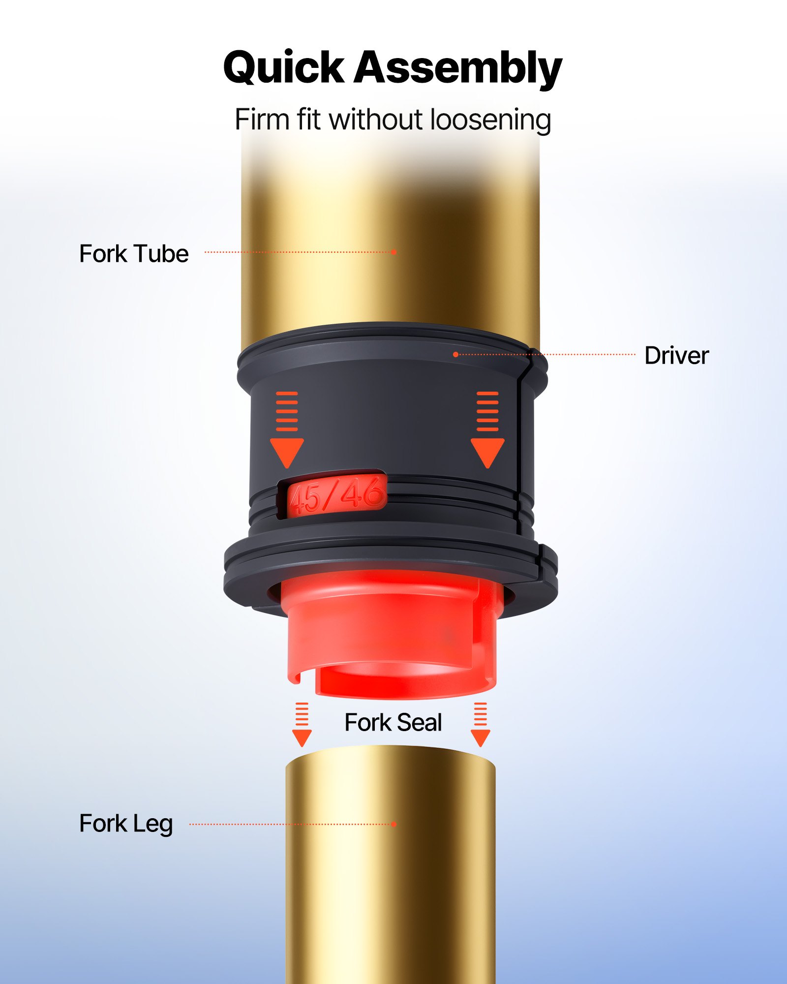 Easy Installation: Our bearing seal driver kit’s setup requires applying fork oil to the new seal’s inner surface for smooth sliding. Then gear the bike seal together and slide the seal installation tool several times until the fork seal is in place