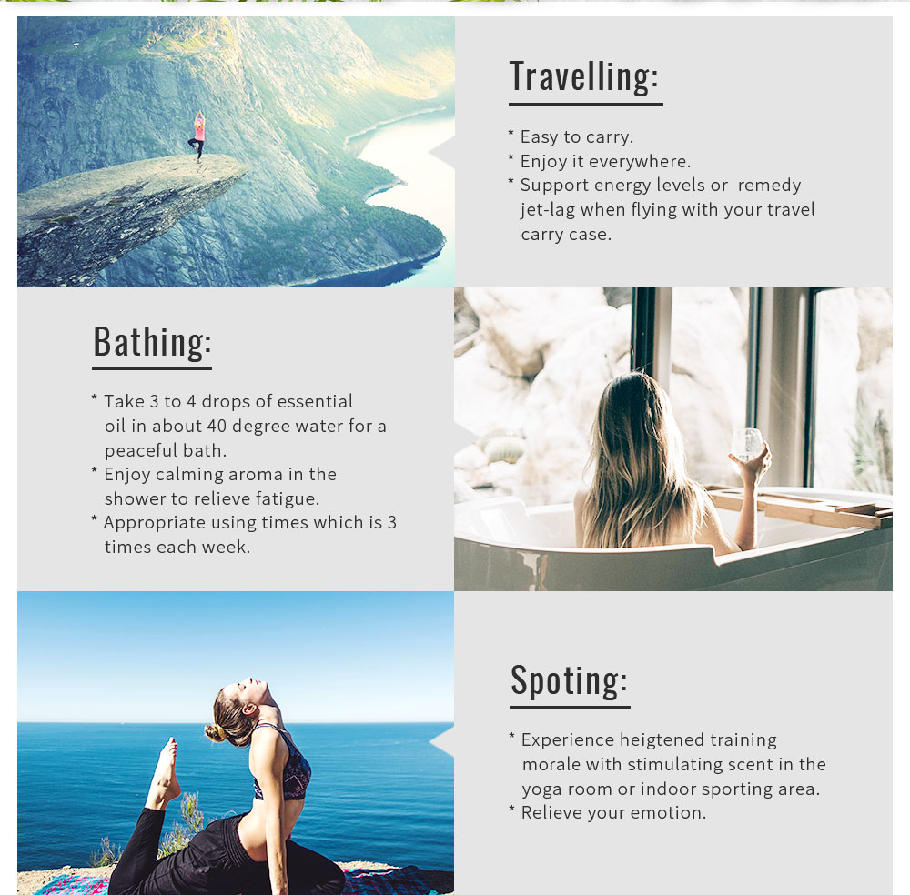 Massage-Our oil is strong, so please do not use it directly on your skin. Add a few drops of carrier oil (such as grape seed oil), and then massage the forehead, palms, neck, back, feet or other affected areas. The effect is wonderful.