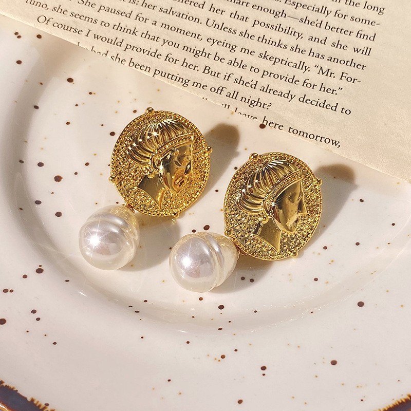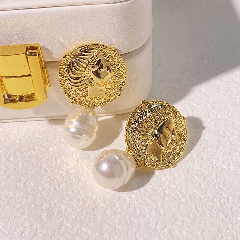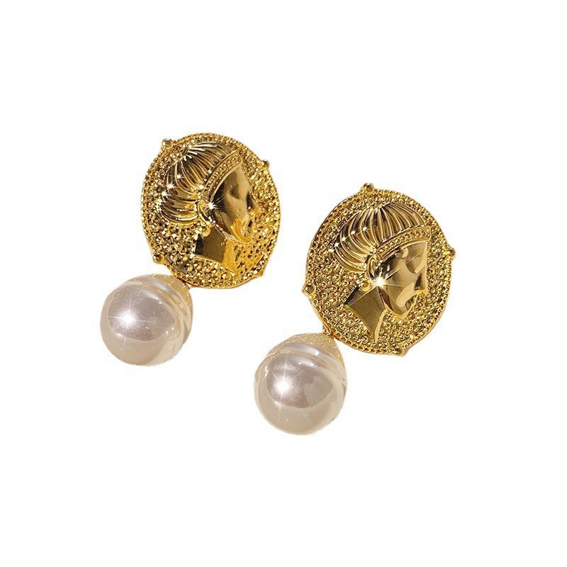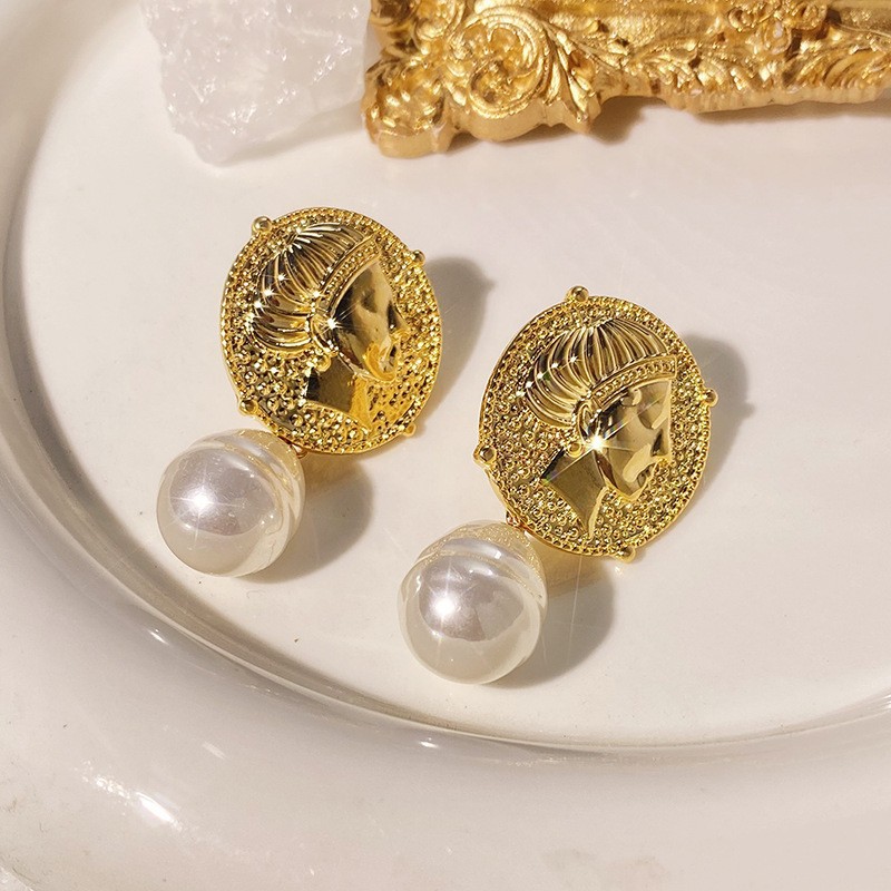 Beauty Head Carving Golden Portrait Pearl Female Retro Earrings