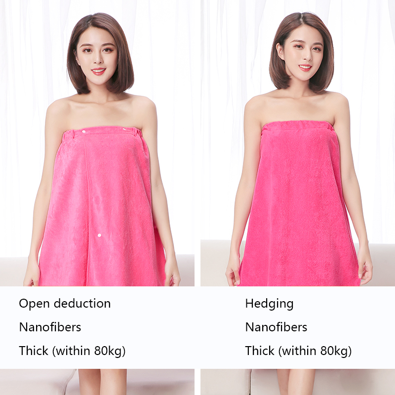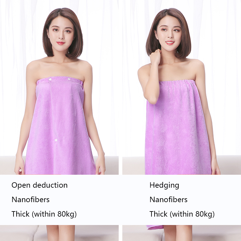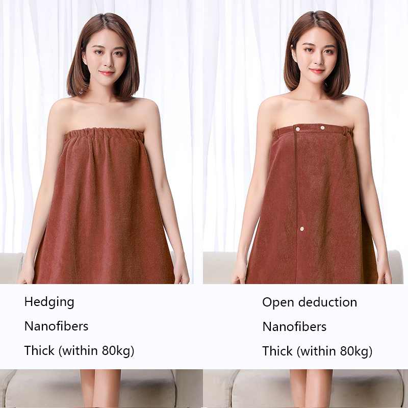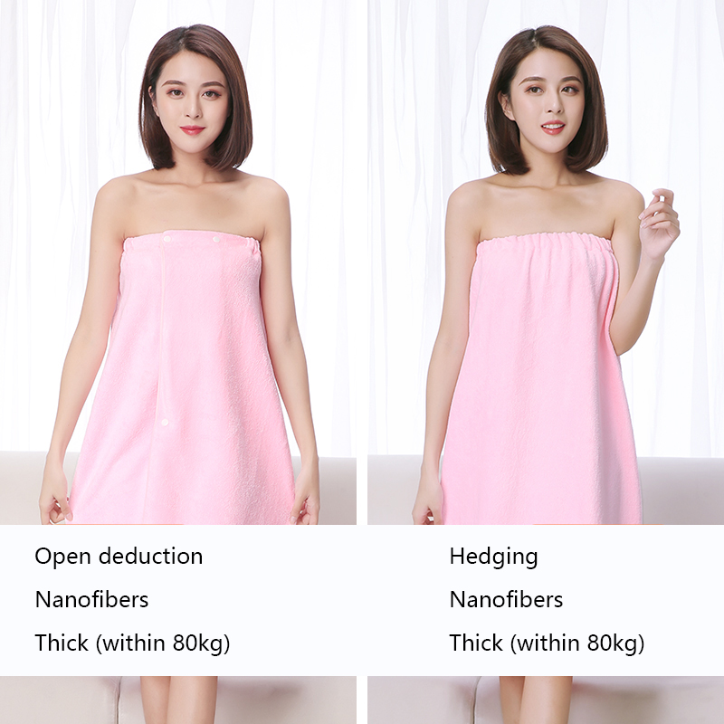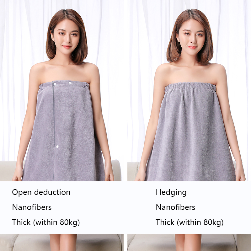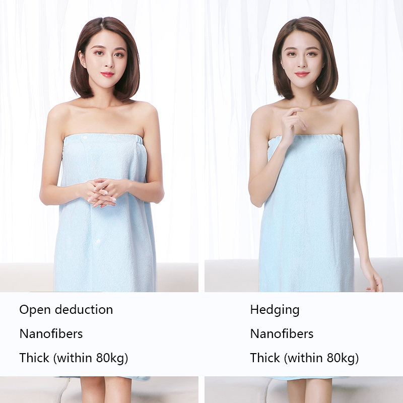 The bath skirt is divided into hedging and buckle styles, which are divided into thick styles and thin styles. The thin style is suitable for spring, summer and autumn, and the thick style is suitable for autumn and winter. The selected material is superfine fiber. Strong water absorption and super soft.