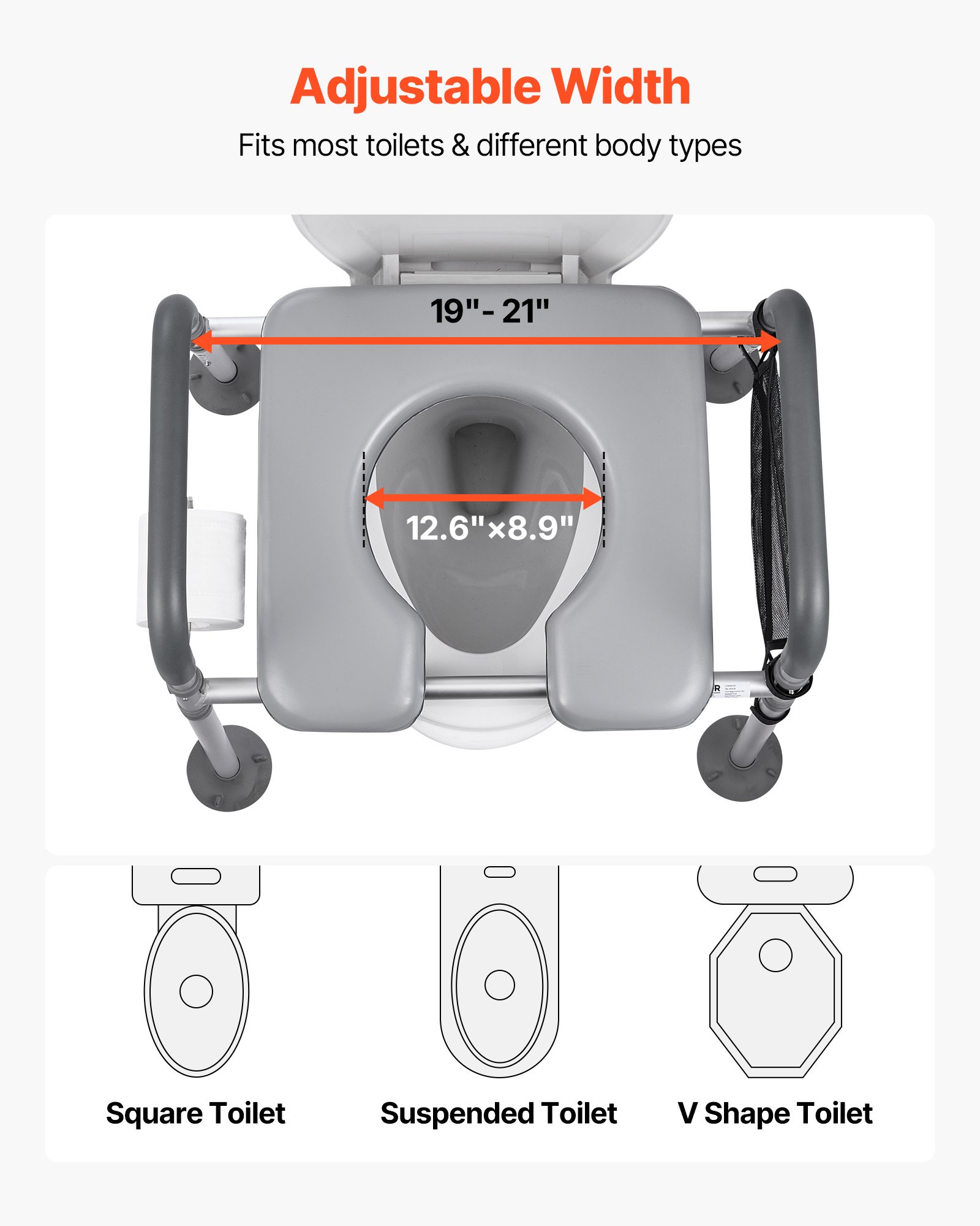 Adjustable Width & Height: This bedside commode chair features 4-level height adjustment via snap buttons, with a seat height range of 20.5-23.4 in/520-595 mm and armrest width of 19.1-21.1 in/485-535 mm. It fits various body types and toilet heights