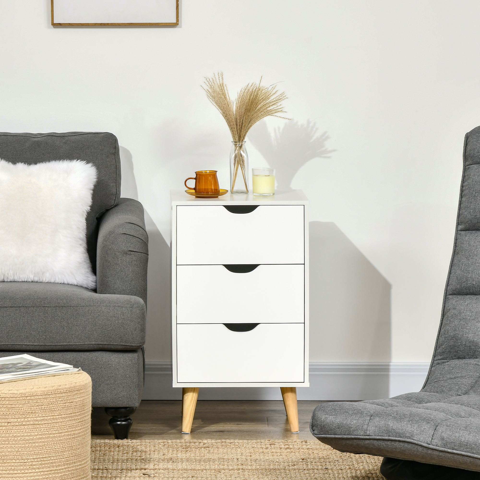 A stylish storage solution to update your bedroom: this telephone table. It comes with three drawers: good amount of for clothing. All drawers have cut-out groove handles to open and close easily. Made from particle board, this 3 drawer bedside table is stable, with wooden legs for strong support. Comes with anti-tipping straps to safely fix to a wall.
