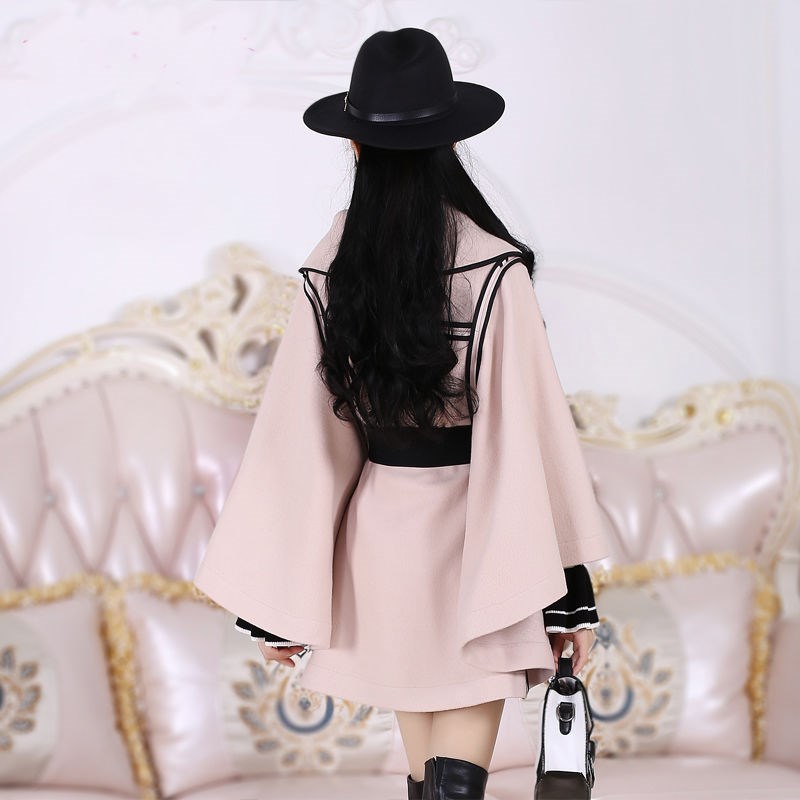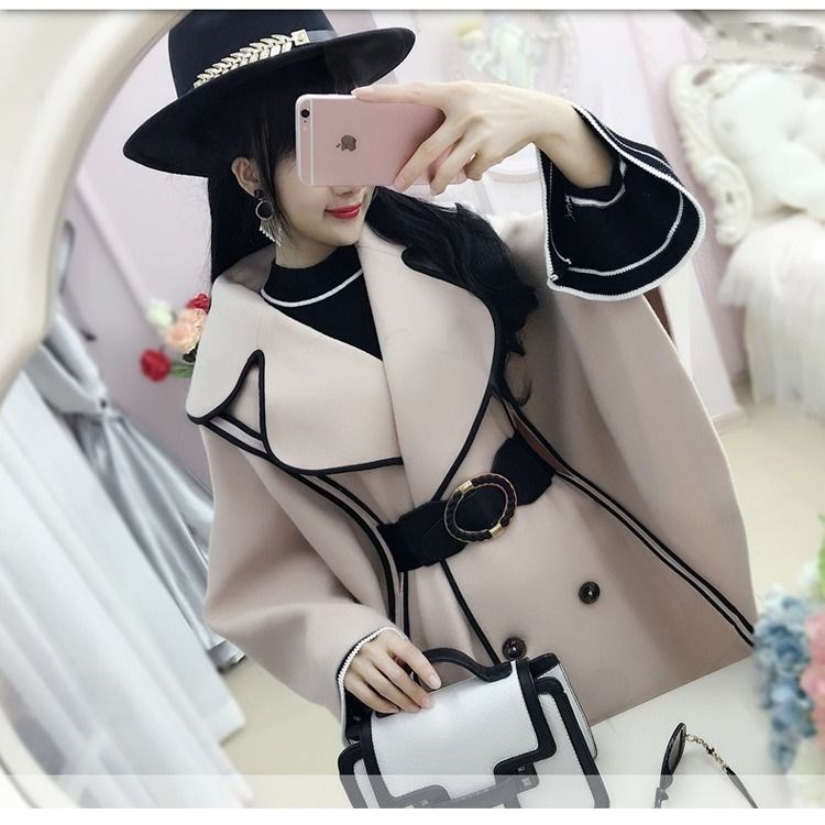 Color classification: beige woolen coat-with belt [single piece] beige woolen coat + black trumpet sleeve top