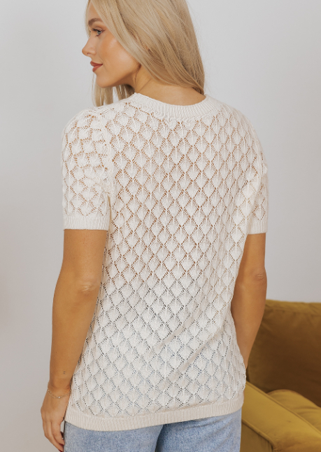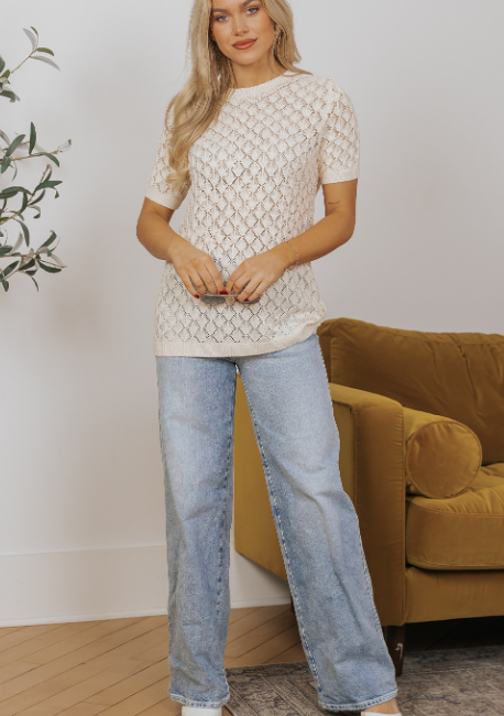 Beige Hollow Out Crochet O Neck Short Sleeve Sweater Tee