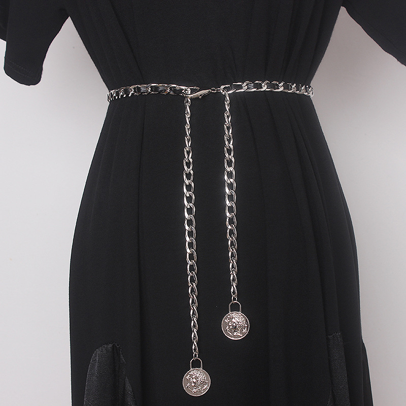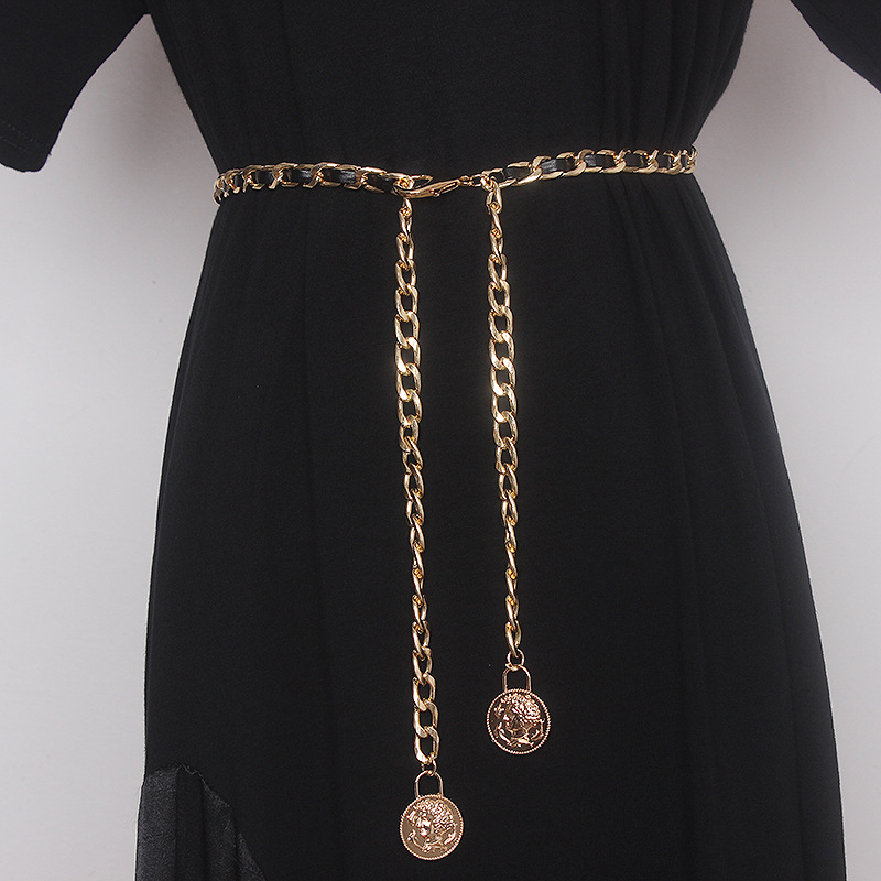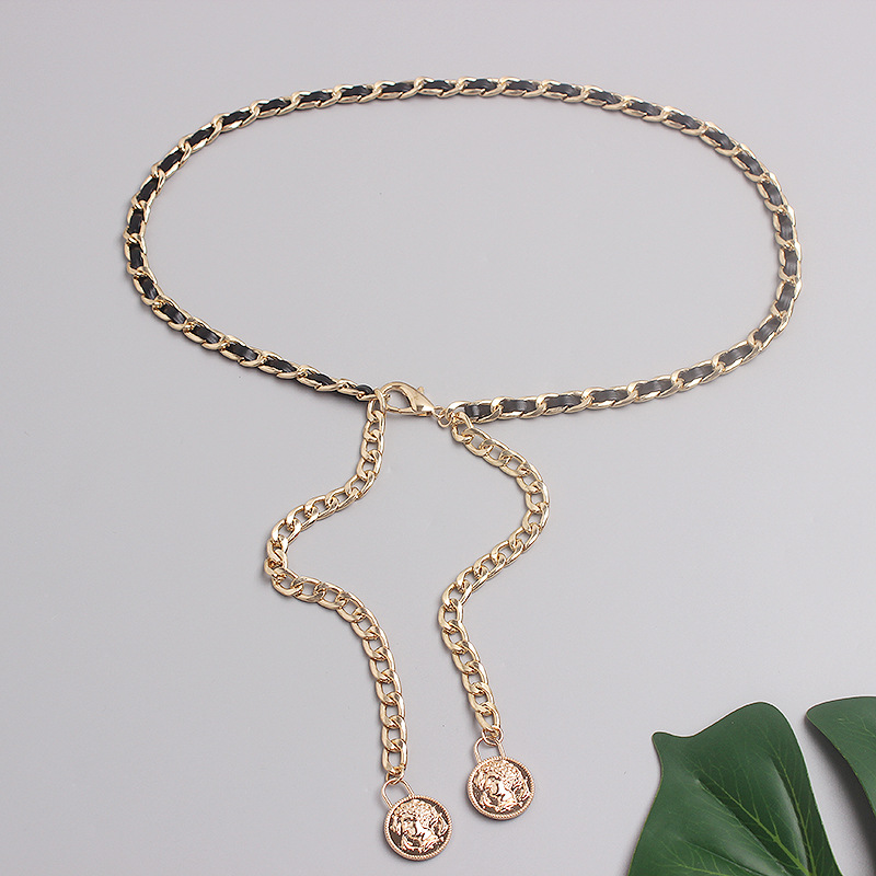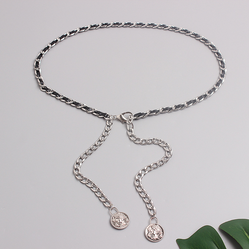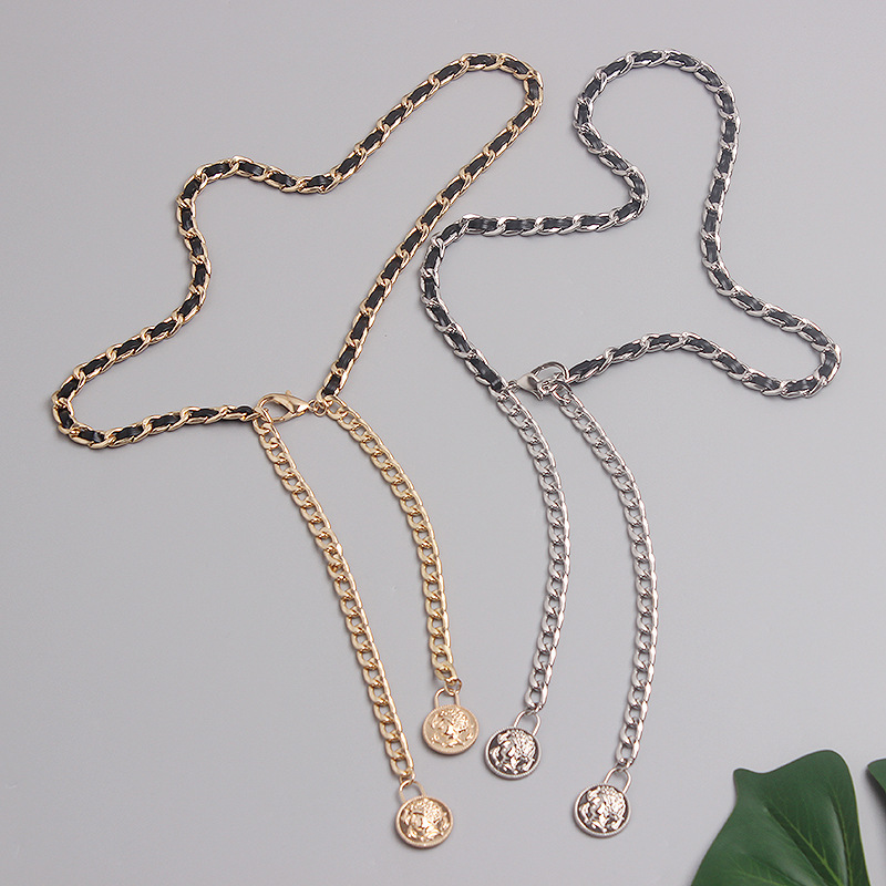 Color: Black/Gold Leather Cord Metal Waist Chain, Black/Silver Leather Cord Metal Waist Chain