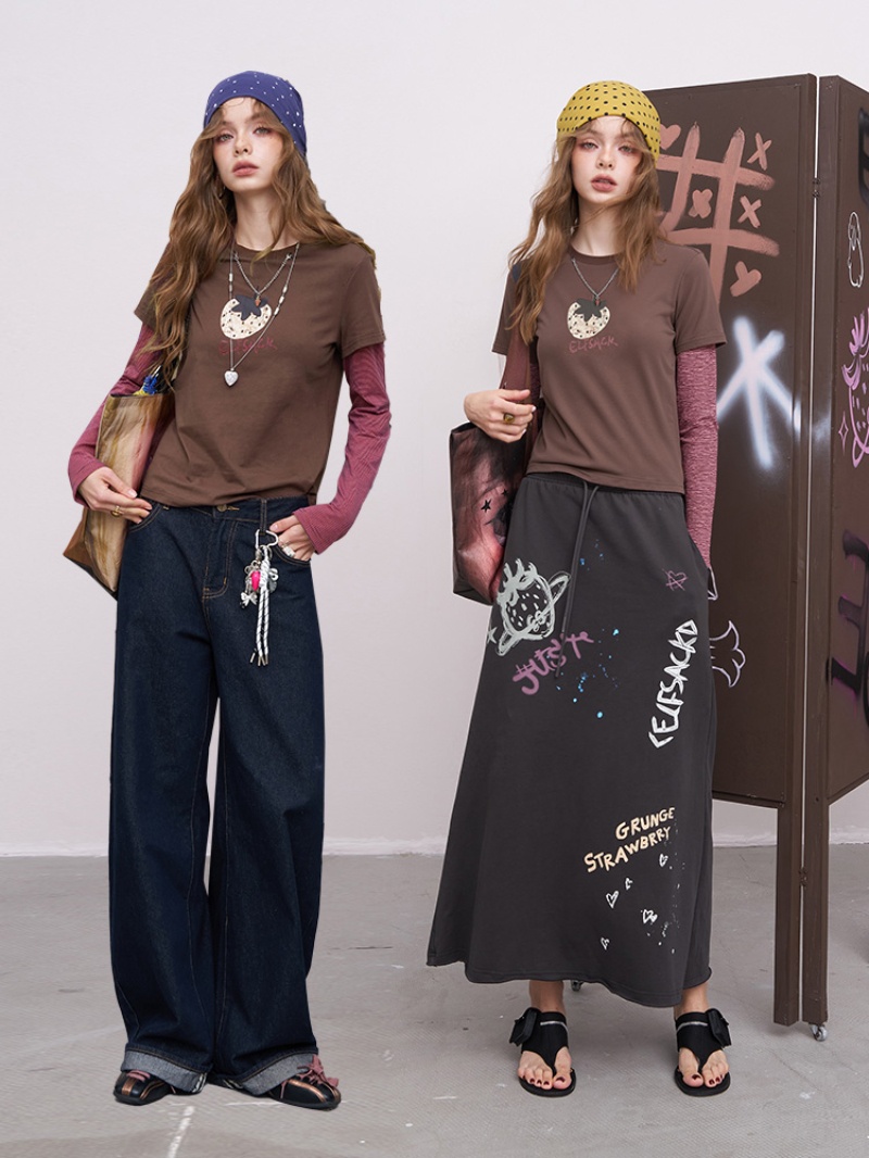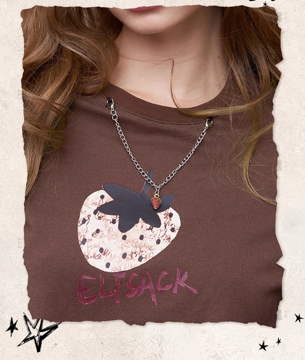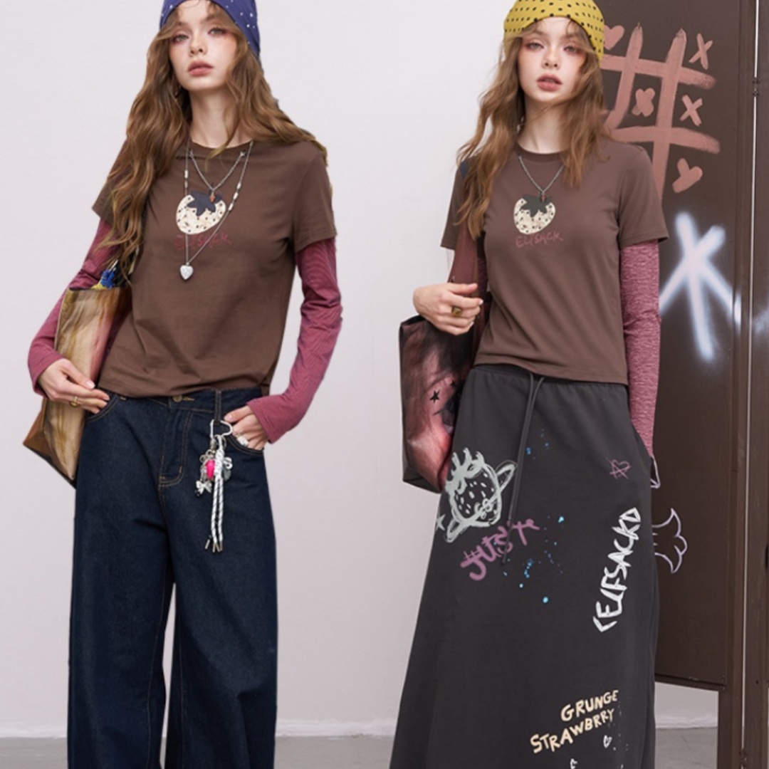 Berry Heart Berry Lung False Two-Piece Retro Strawberry Print Long Sleeve T-Shirt Women's Design Sense Top