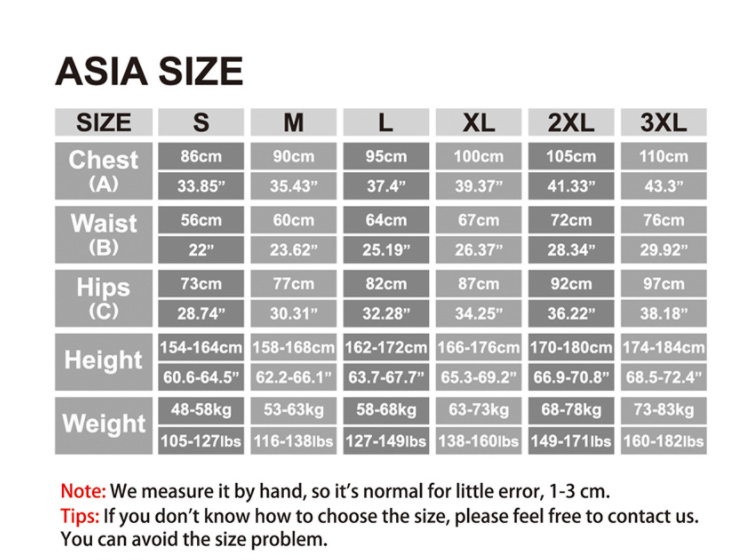 Note:1. Asian sizes are 1 to 2 sizes smaller than European and American people. Choose the larger size if your size between two sizes. Please allow 2-3cm differences due to manual measurement. 2. Please check the size chart carefully before you buy the item, if you don't know how to choose size, please contact our customer service. 3.As you know, the different computers display colors differently, the color of the actual item may vary slightly from the following images.