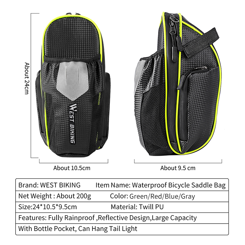 Product DescriptionMaterial: NylonFunction: Bicycle tail bagCapacity: 2LColor: red, green, blue, blackSize: 8 inchesPacking listTail bag x1