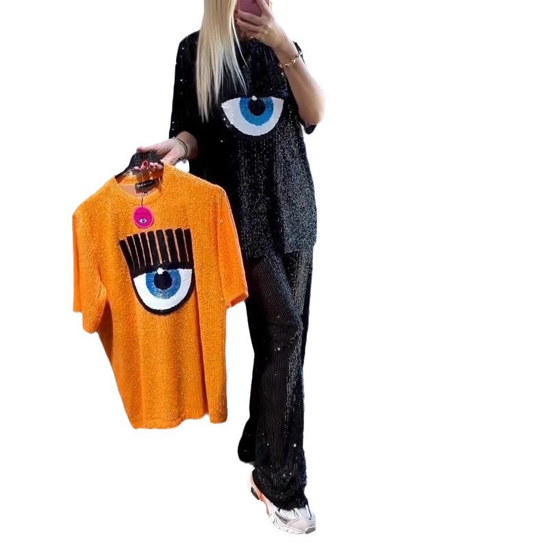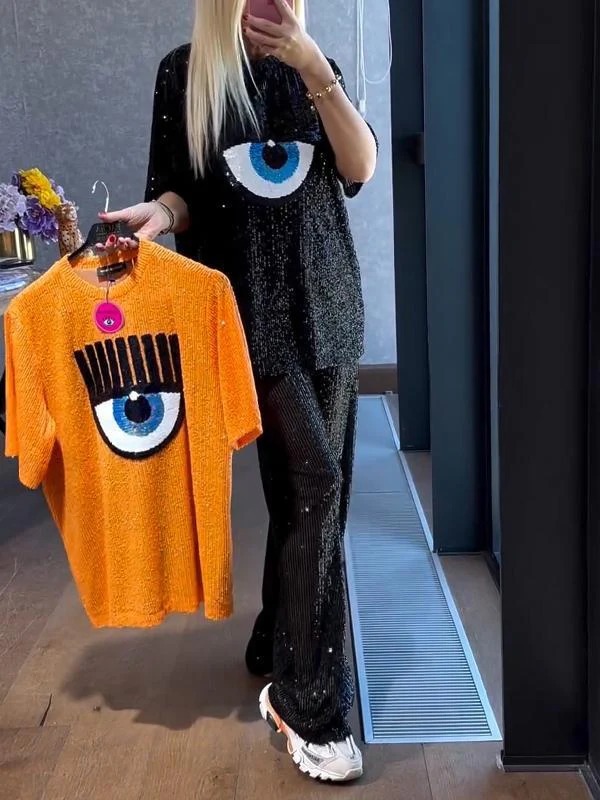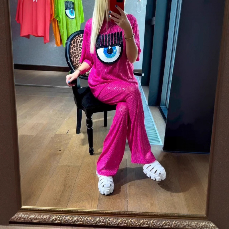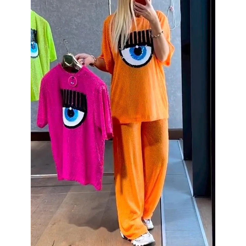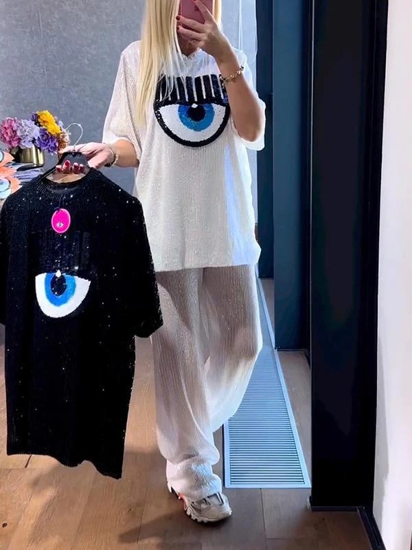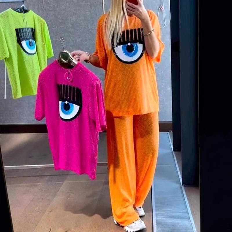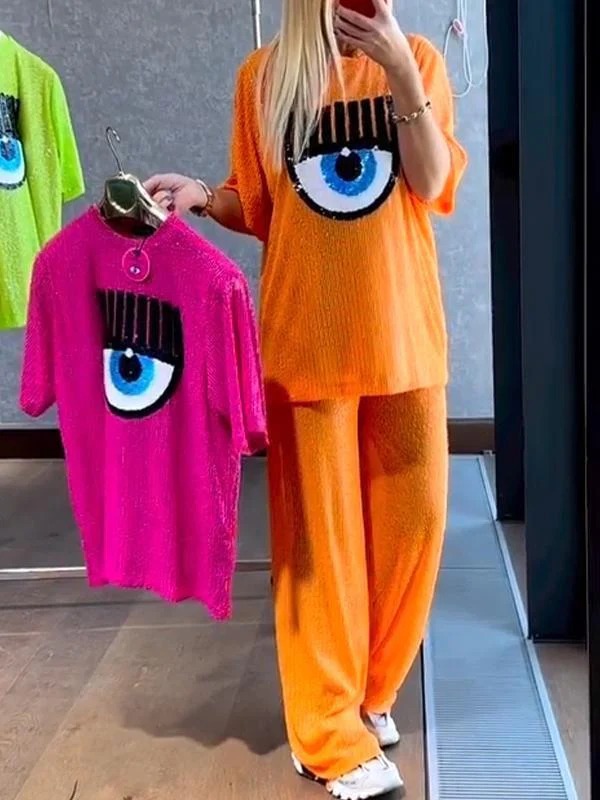 Big-Eye Crew-Neck Loose Womens Three-Quarter Sleeve Set