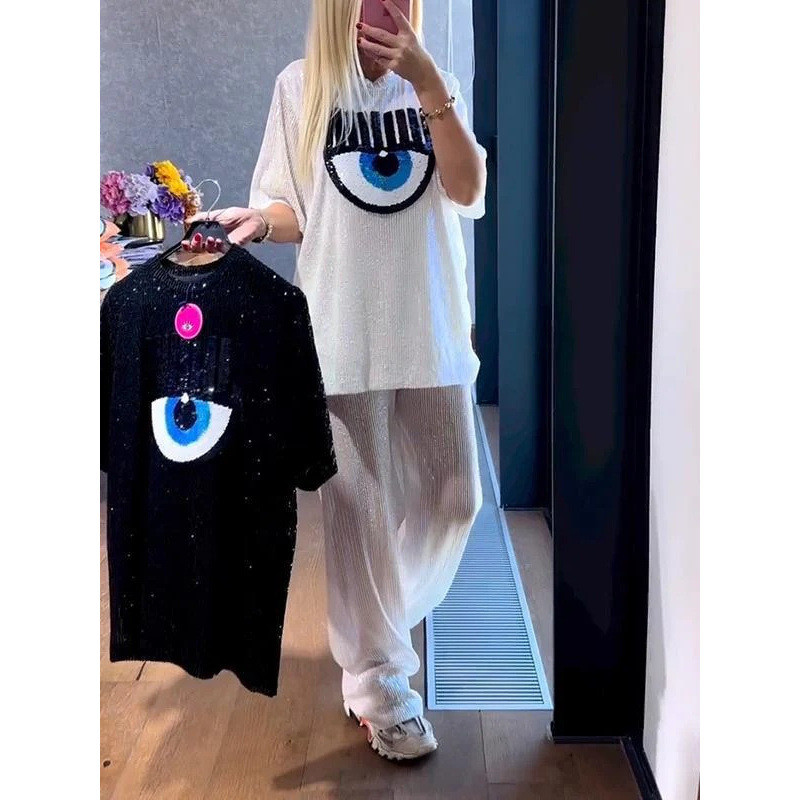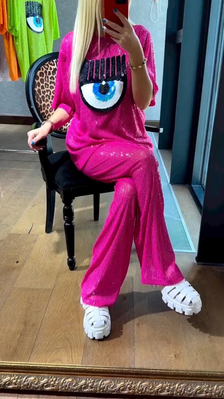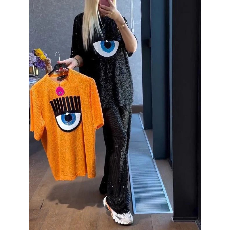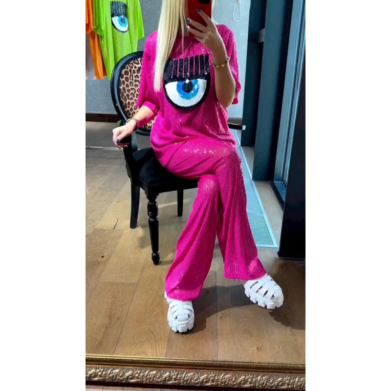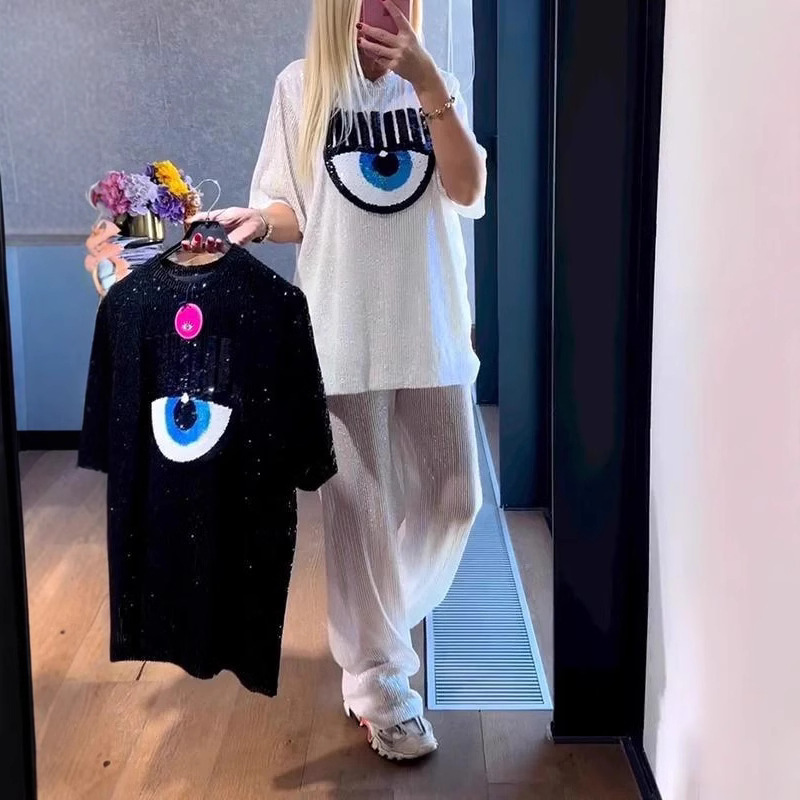Big-Eye Crew-Neck Loose Womens Three-Quarter Sleeve Set