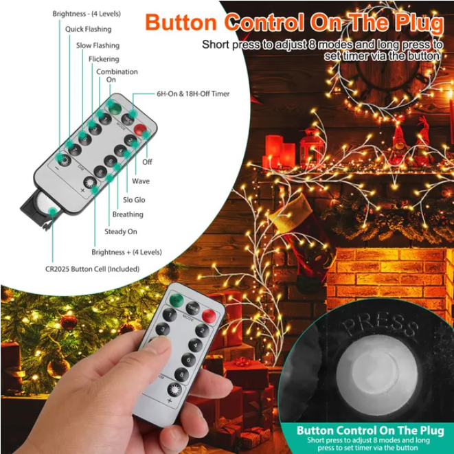 Birch Flower Wreath With Light String And Timer, 8 Modes, IP45 Waterproof