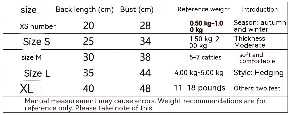 Size: XS back length 20cm (recommended 0.50 kg-1.00 kg, S back length 25cm (recommended 1.50 kg-2.00 kg, M back length 30cm (recommended 2.50 kg-3.50 kg, L back length 35cm (recommended 4.00 kg-5.00 kg, XL back length 40cm (recommended 5.50 kg-9.00 kg