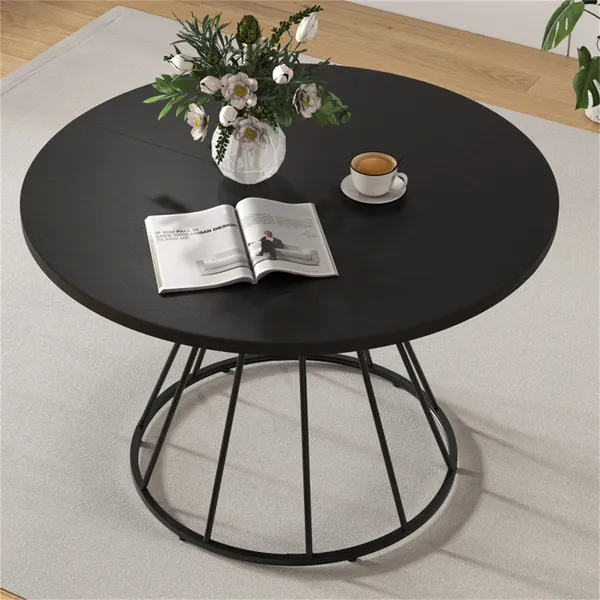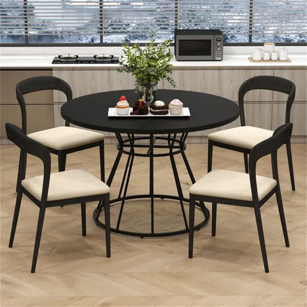 • Family-Sized Dining Solution: Designed to foster intimate family gatherings, this 47" round dining table comfortably accommodates 4-6 people. Its generous surface provides ample space for cozy meals and spirited conversations, making every mealtime a special occasion. • Stable and Reliable Construction: Built with a robust metal frame and a 1.2" thick tabletop, this dining table ensures stability and longevity. It is further enhanced with adjustable foot pads, keeping the table stable and balanced on the uneven floors. • Stylish and Elegant Appearance: The table boasts a unique metal base with an hourglass shape, paired with a tabletop with elegant curves, bringing a modern elegance that complements any dining room decoration. Plus, the absence of corners enhances safety, minimizing sharp edges. • Effortless Upkeep and Installation: The round table is designed with a premium veneered MDF tabletop that is waterproof and scratch-resistant, making spills easy to wipe away. With its simple structure and clear illustrations in the user's manual, it is easy to set up. • Versatile Use: Beyond dining, this table adapts to various household activities. It serves as an ideal canvas for game nights, crafting sessions, or even as a study station for children, adapting seamlessly to your evolving needs. It measures 47" x 30" (Dia. x H).