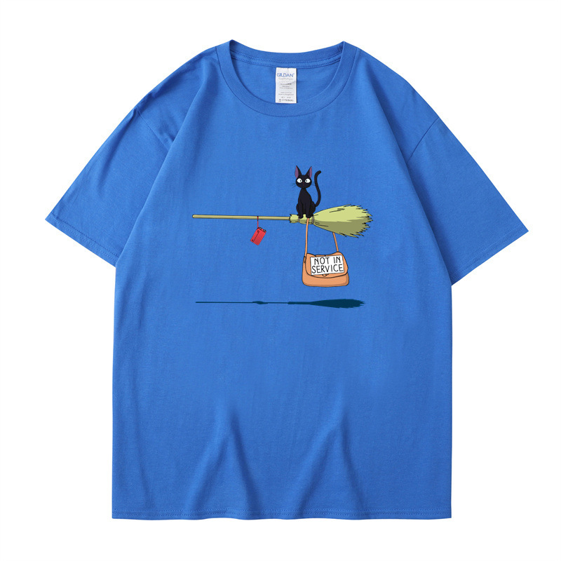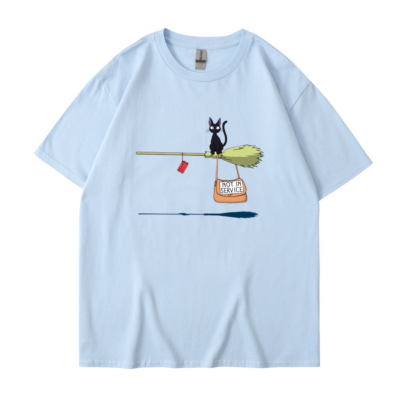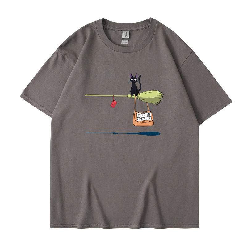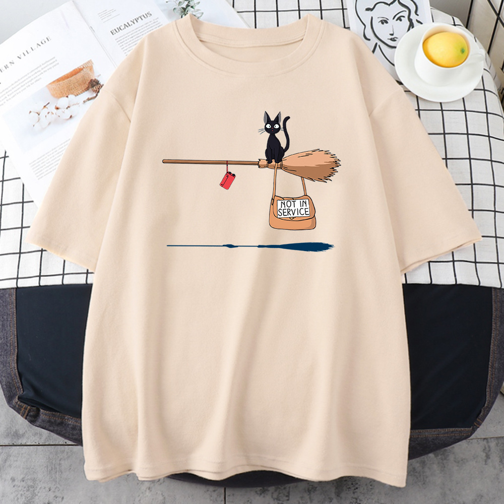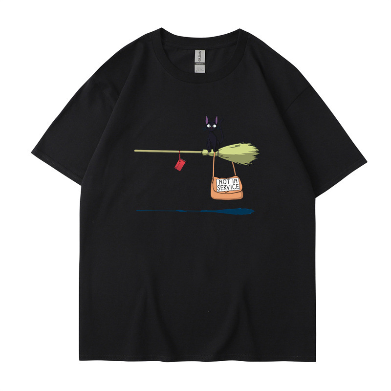 Black Cat Suspended Service Text Pattern Short Sleeve T-shirt Riding Broom