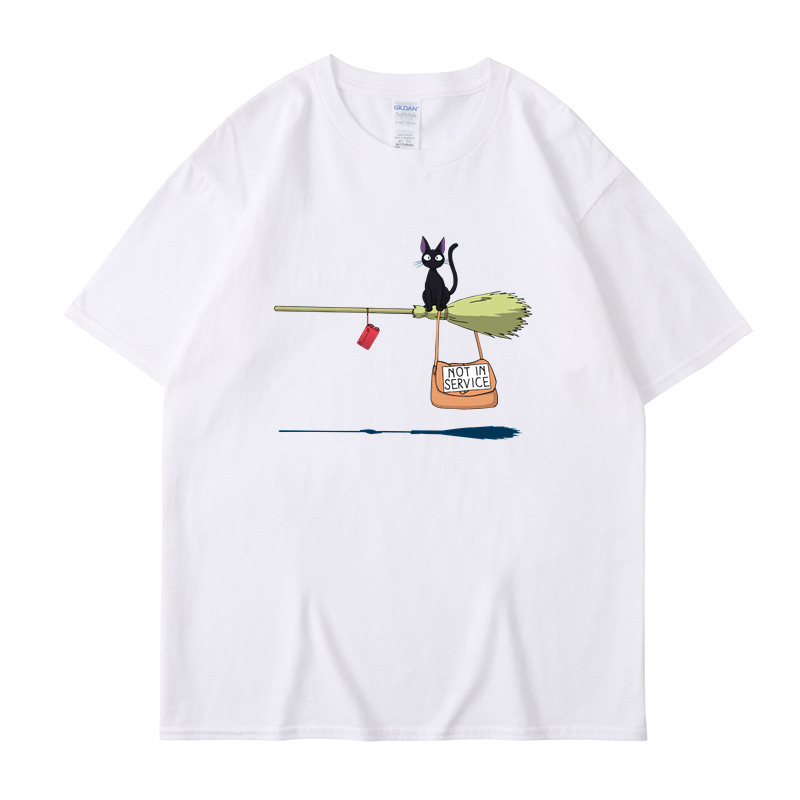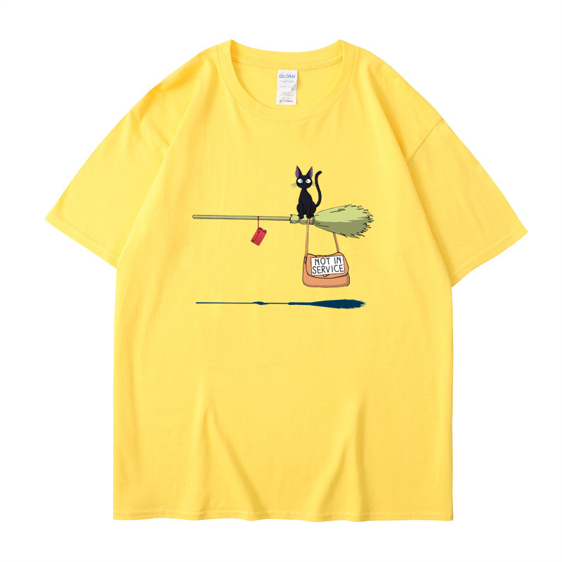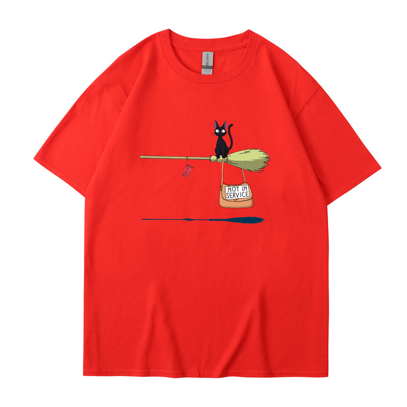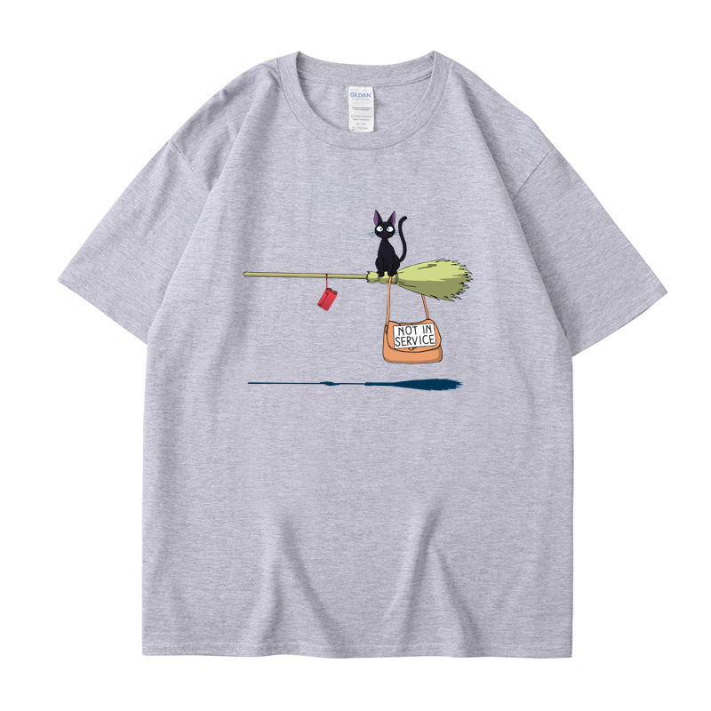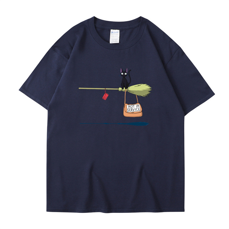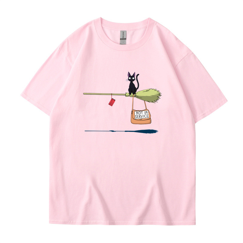 Black Cat Suspended Service Text Pattern Short Sleeve T-shirt Riding Broom