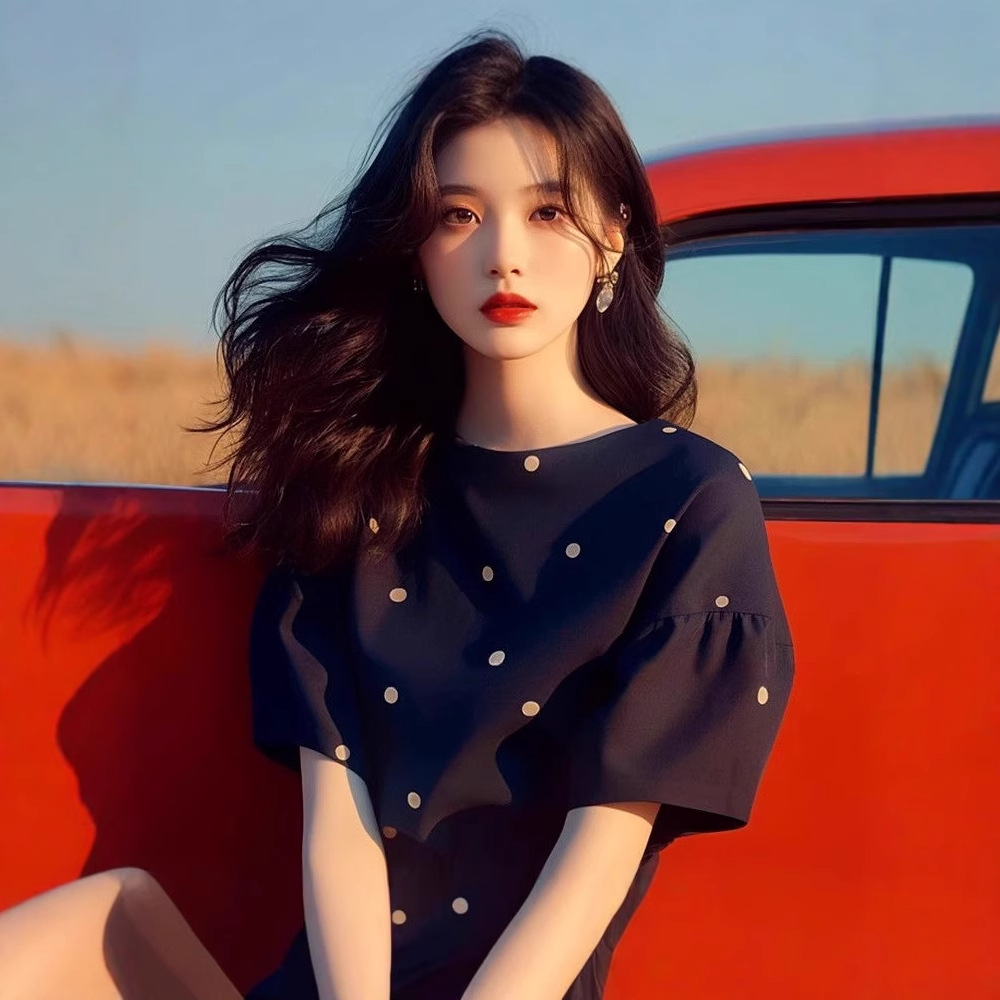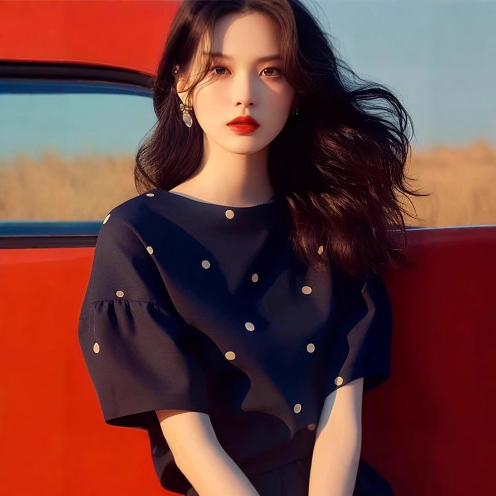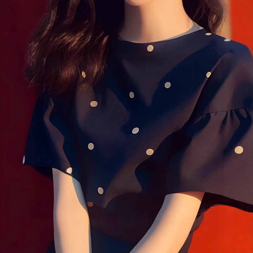 Black Dark Blue Polka Dot Short Sleeve T-shirt