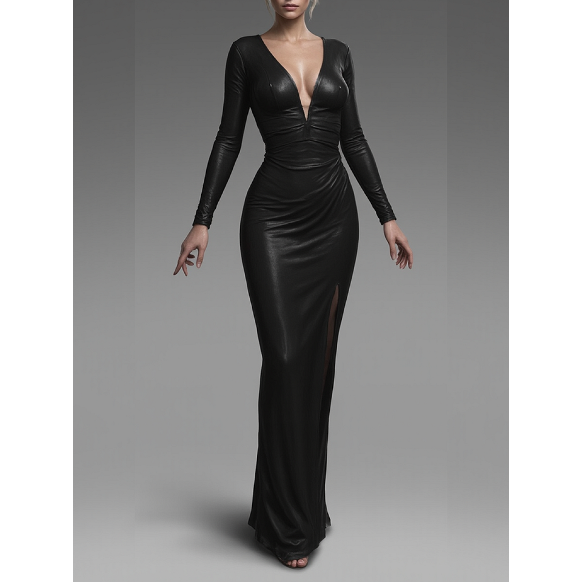 Black Deep V Backless Long Sleeve Dress