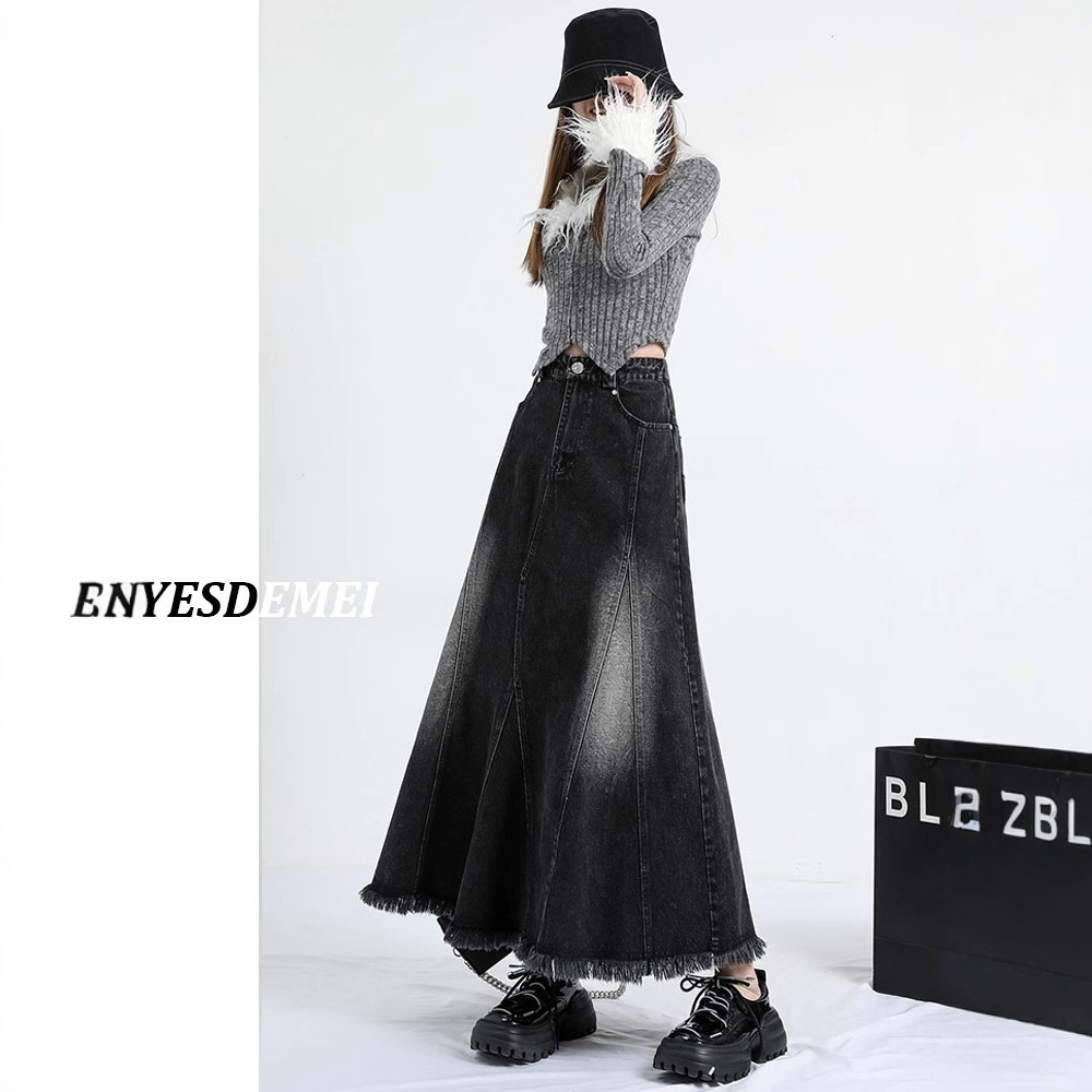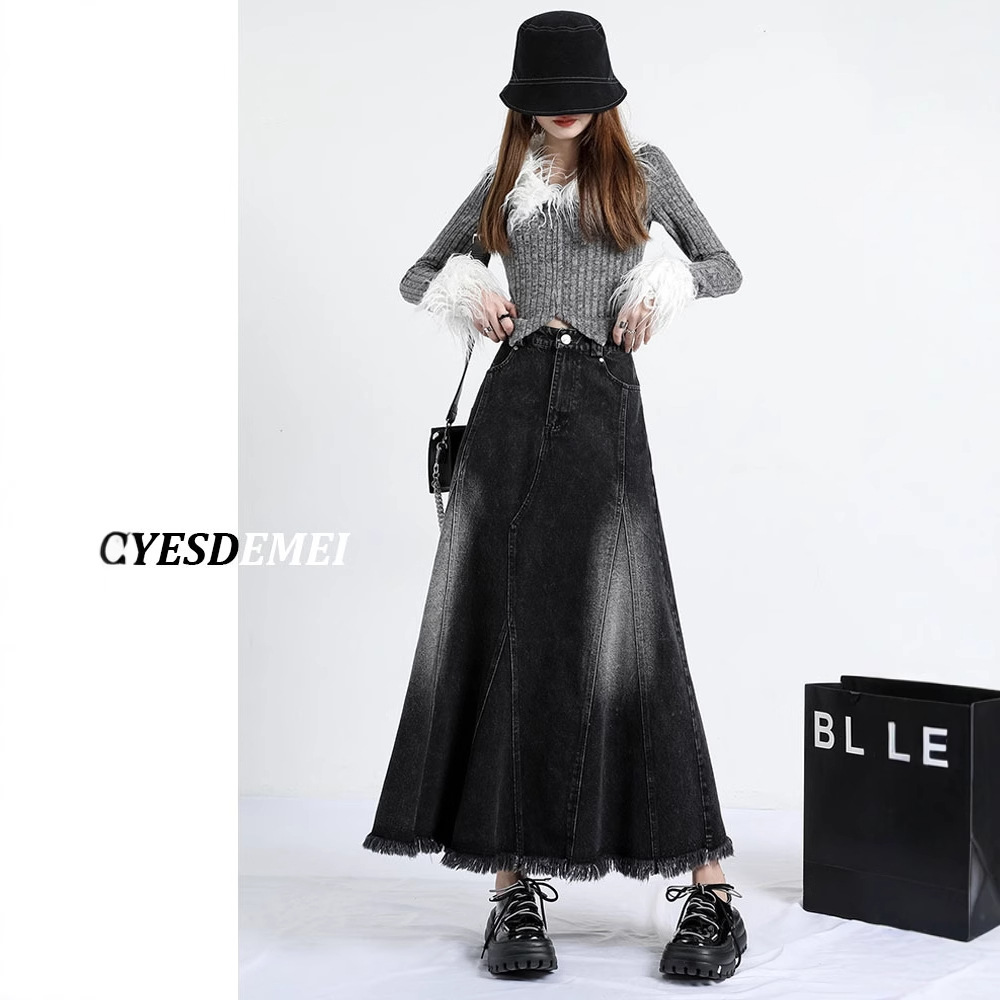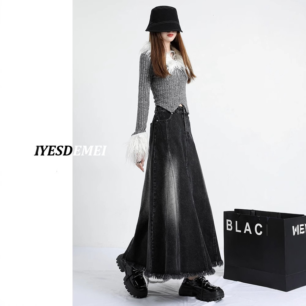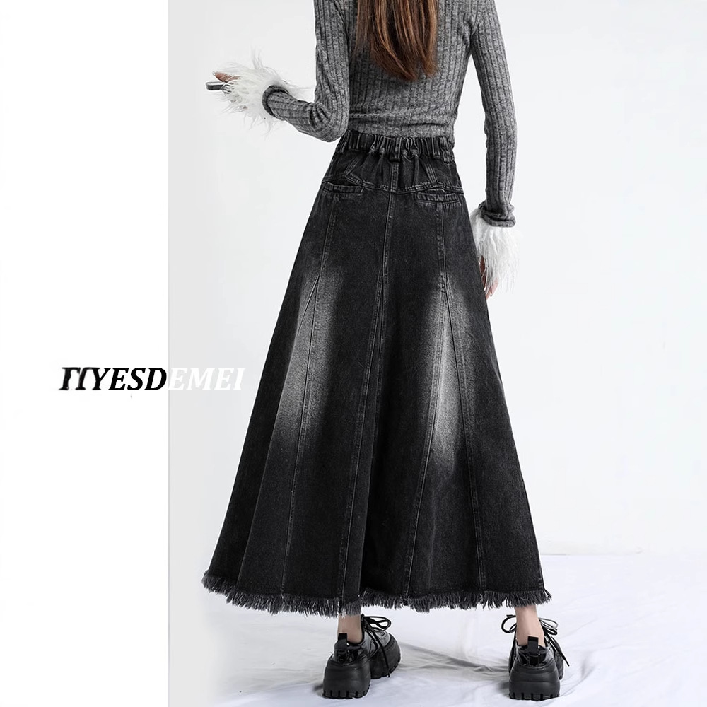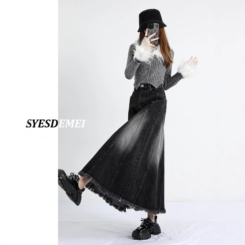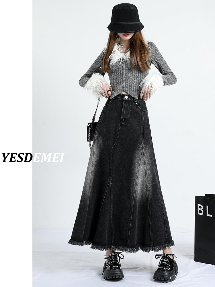 Black Denim Skirt Women's Irregular Mid-length A- Line Version Burrs Slimming