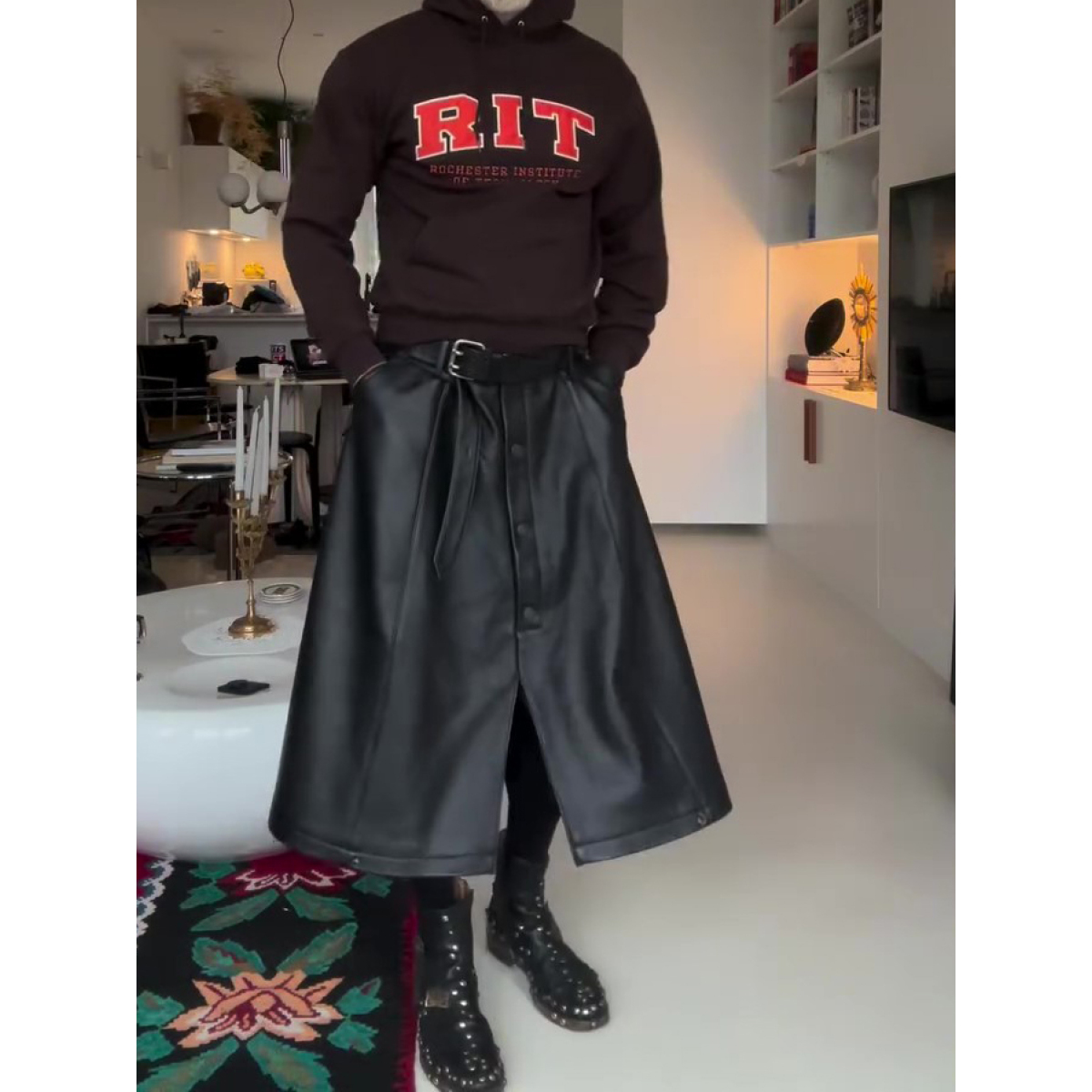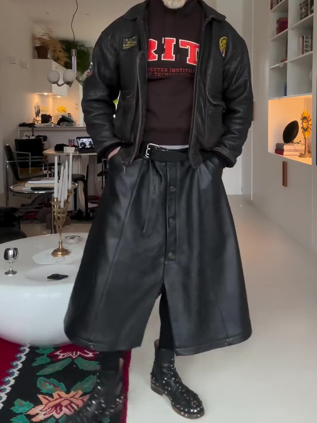 Black Leather Wide-Leg Midi Skirt