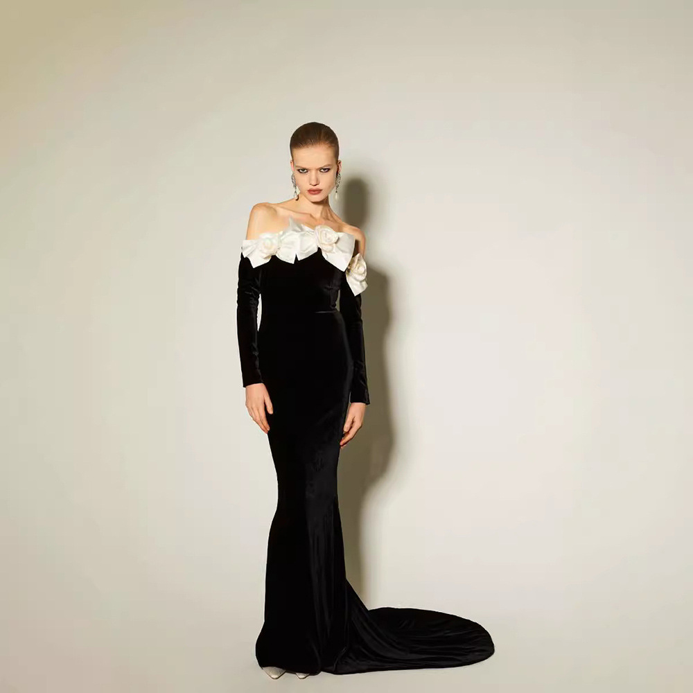 Black Long Sleeve Velvet Dress Fishtail Gown