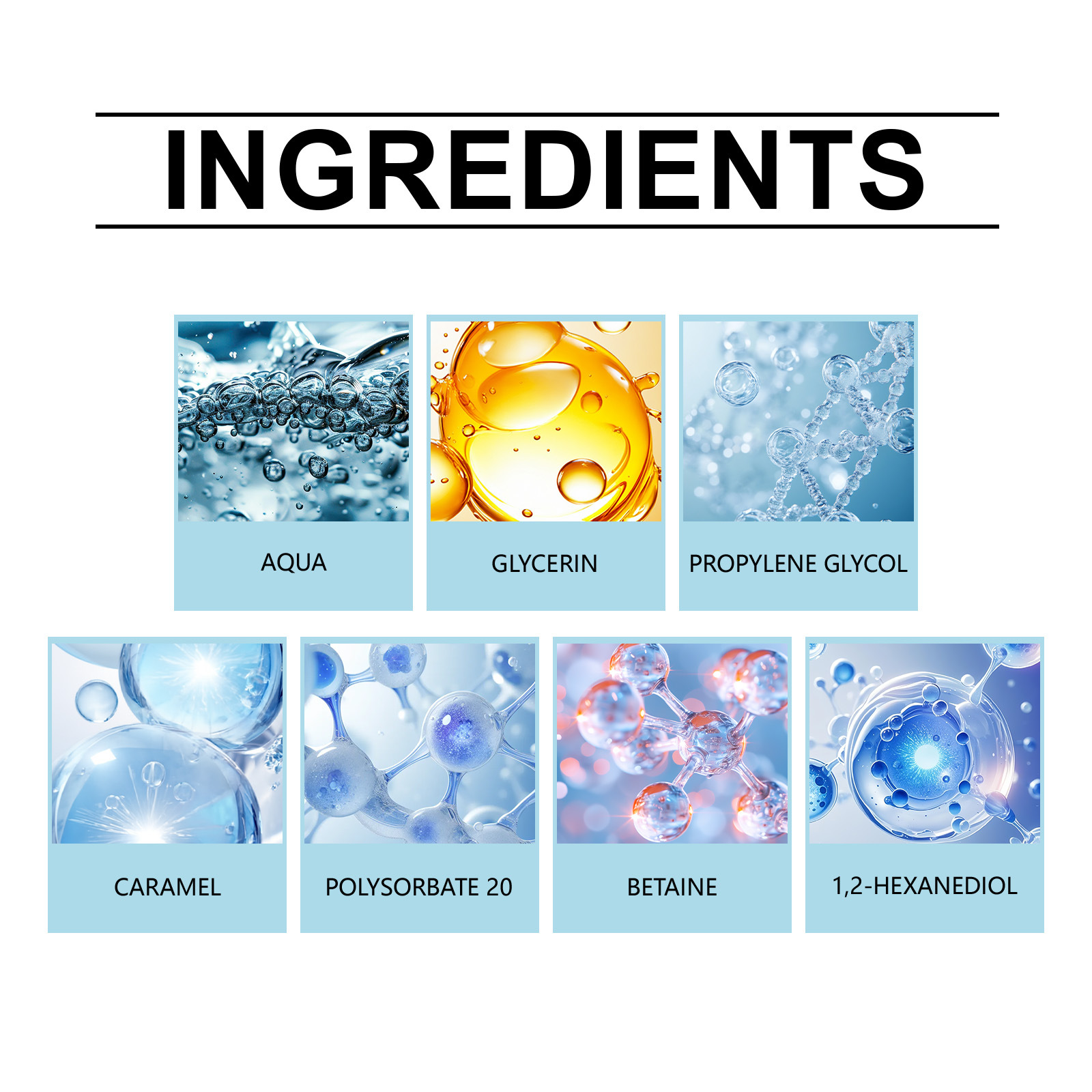 Product information:Ingredients: water, glycerin, propylene glycol, caramel color, polysorbate -20, betaine, 1,2- hexanediol.