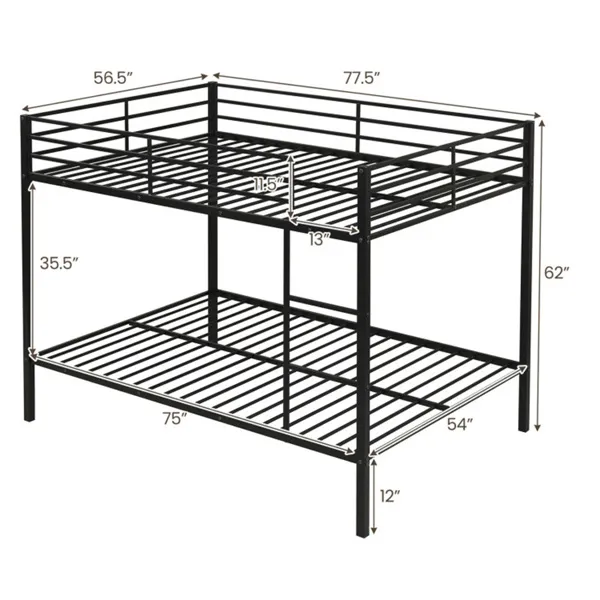 Color:Black Material:Metal Overall Dimensions:77.5' x 56.5' x 62'(L x W x H) Bed Surface:75' x 54'(L x W) Guardrail Height:11.5' Guardrail Opening:13' Space Between 2 Tiers:35.5' Raised Height from Ground:12' Recommended Mattress Thickness for Upper Bunk:Max 6' Recommended Mattress Thickness for Lower Bunk:Max 10' Weight Capacity of Upper Bunk:250 lbs Weight Capacity of Lower Bunk:350 lbs Net Weight:79.5 lbs Is Assembly Required:Yes