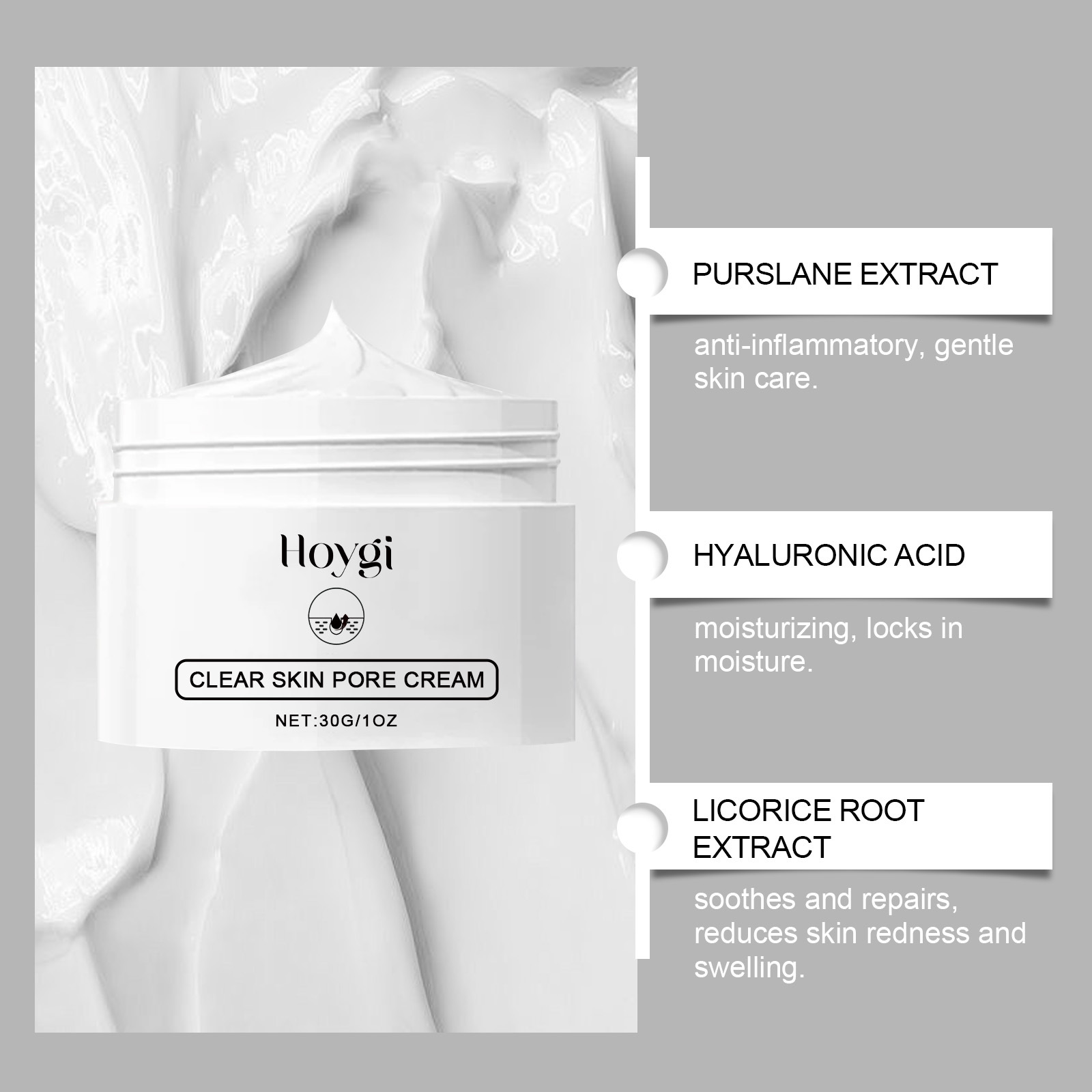Ingredients: Water, glycerin, cetyl stearate, Glyceryl stearate carbomer, triethanolamine, aloe extract, purslane extract, hyaluronic acid, licorice root extract, tea tree oil, salicylate'