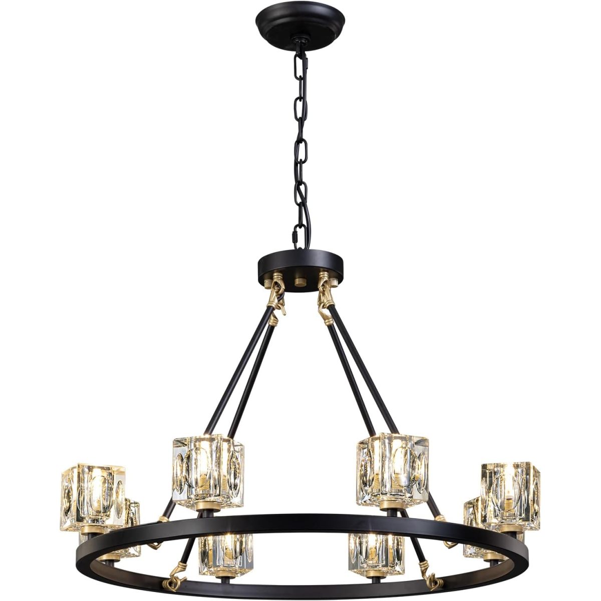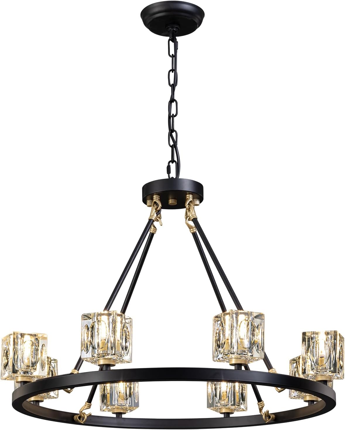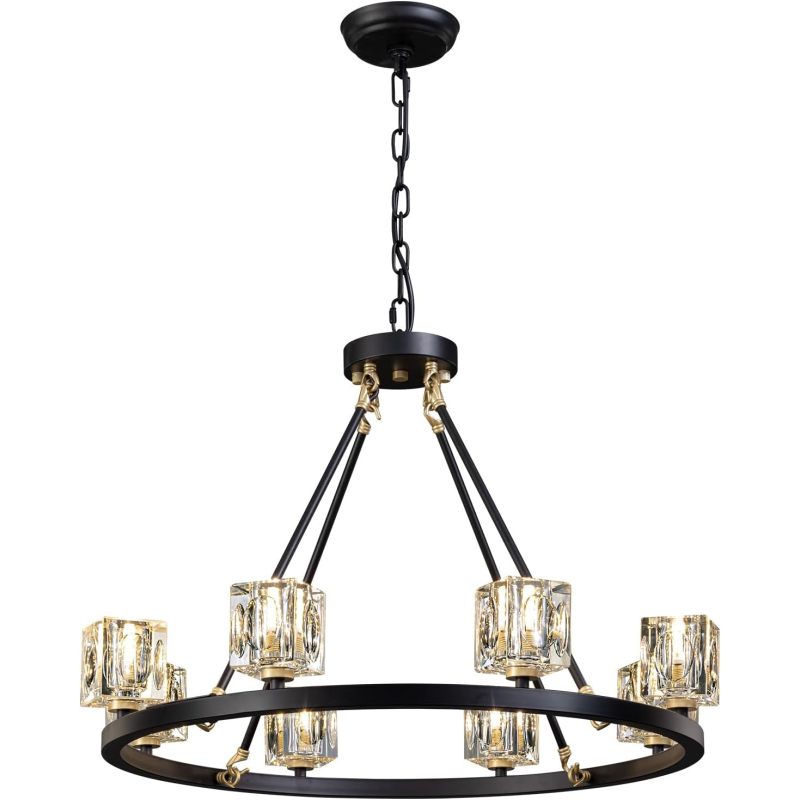 【Farmhouse Wagon Wheel Chandelier】This black-and-gold chandelier features a round carriage-style frame and 8-lights K9 crystal shade that refracts light to a stunning brightness, black Gold and square crystal make the chandelier more modern and farmhouse-style, suitable for dining room, living room, foyer, can also be used as ceiling light in the bedroom, study, suitable for any corner of the home