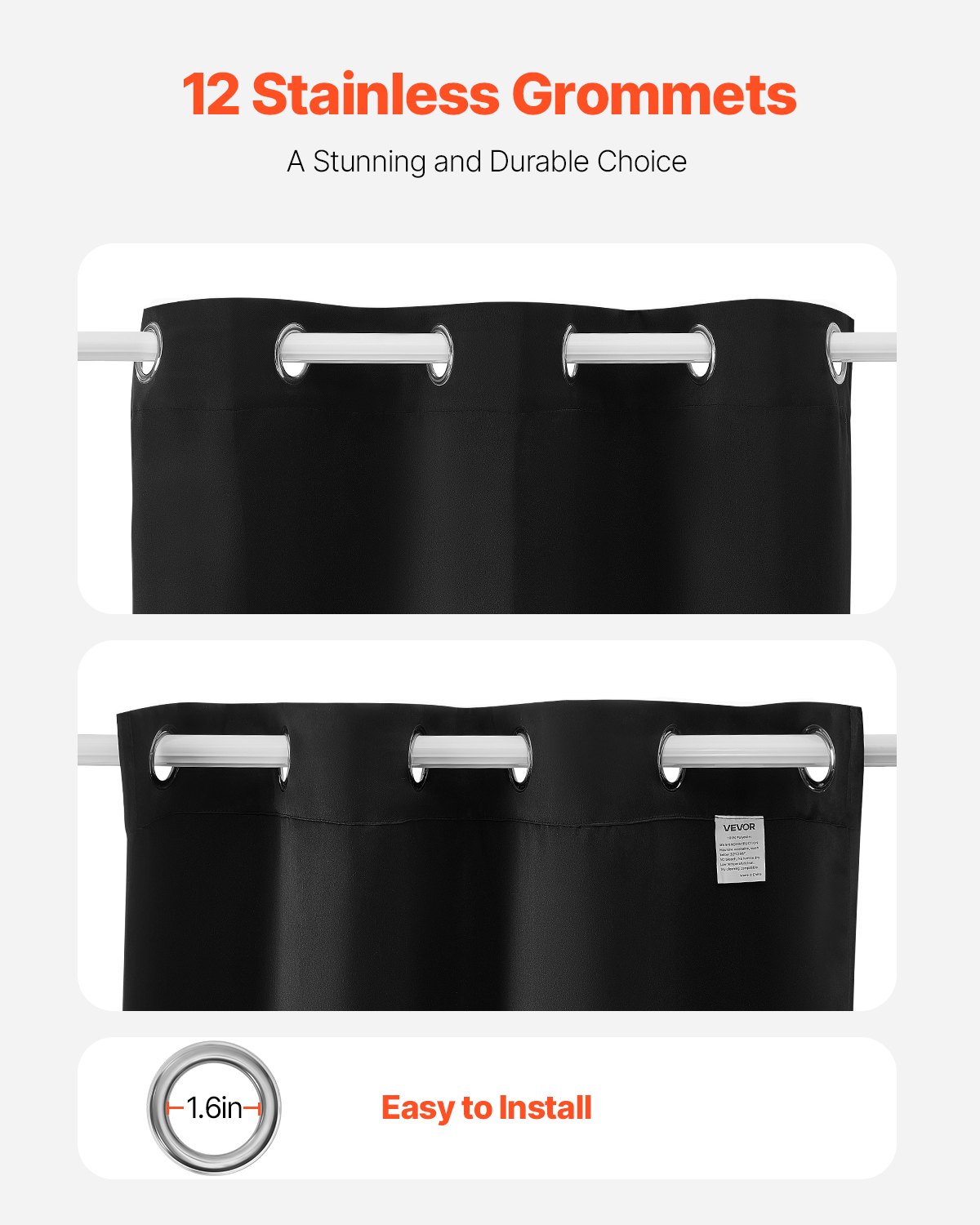 Durable Grommet Design: Each panel is equipped with 6 sturdy stainless steel grommets (1.6-inch inner diameter) for effortless installation and smooth sliding. The rust-proof design ensures long-lasting durability, maintaining its flawless look even after extended use