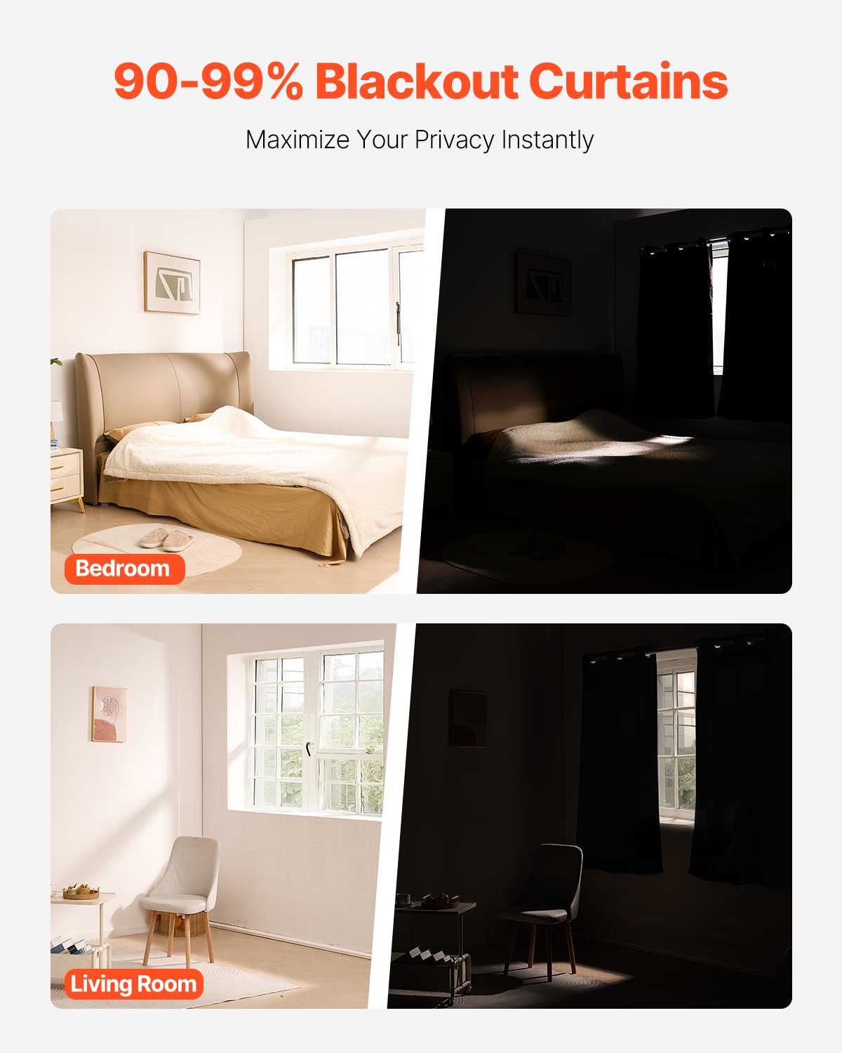 Superior Blackout Performance: Our blackout curtains block 90-99% of sunlight, maximizing privacy and creating a pitch-dark environment instantly. They are suitable for bedrooms, living rooms, and other spaces where complete darkness is needed for quality sleep