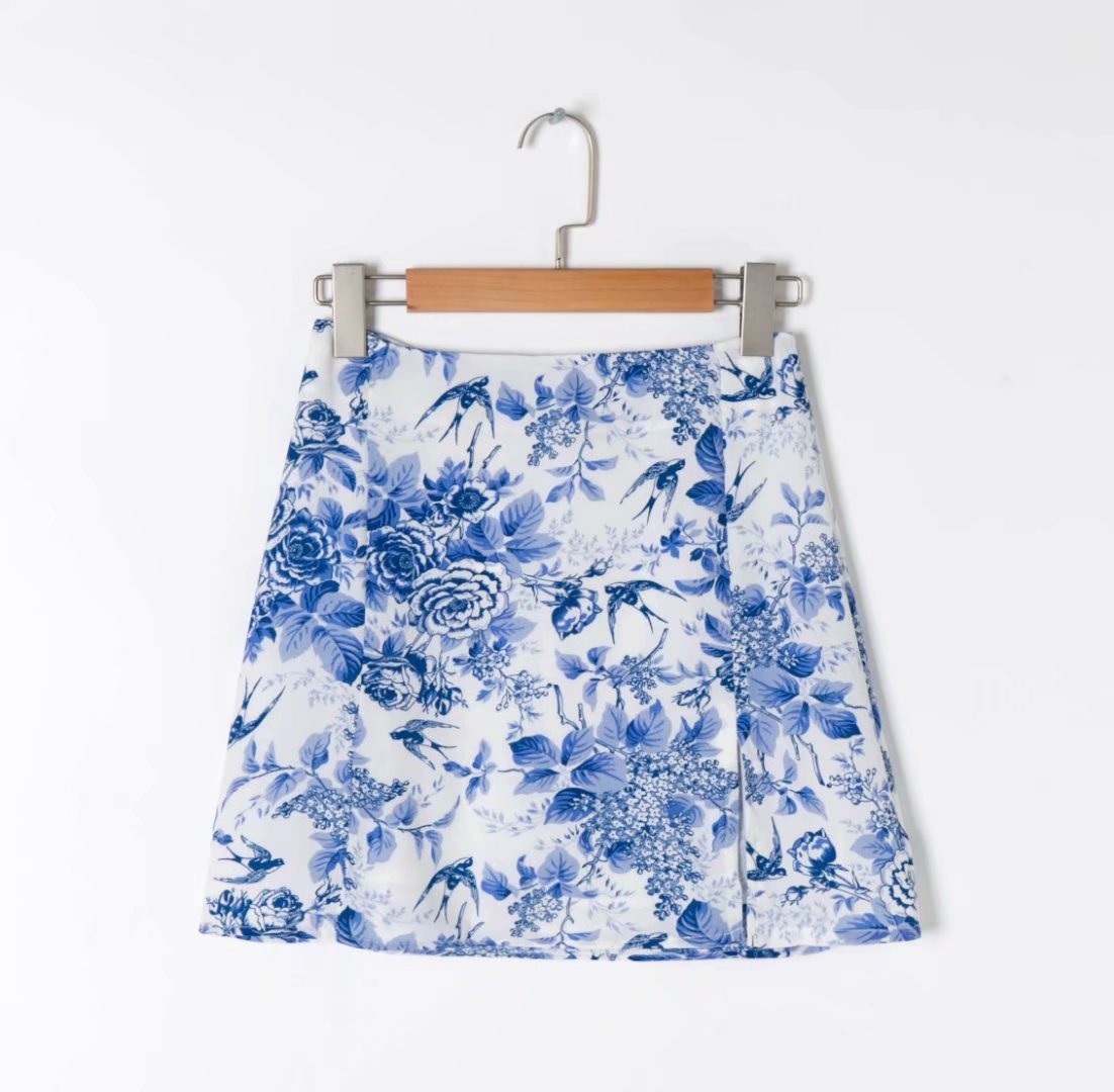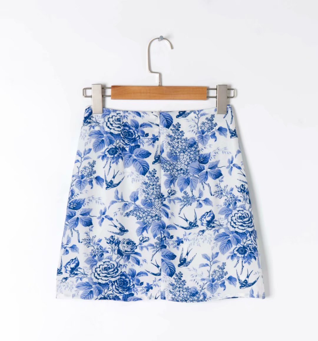 Blue And White Porcelain Printed Stretch Slimming Blue Skirt