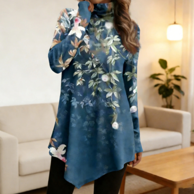 Blue Background Ink Floral Print Turtleneck Loose Top