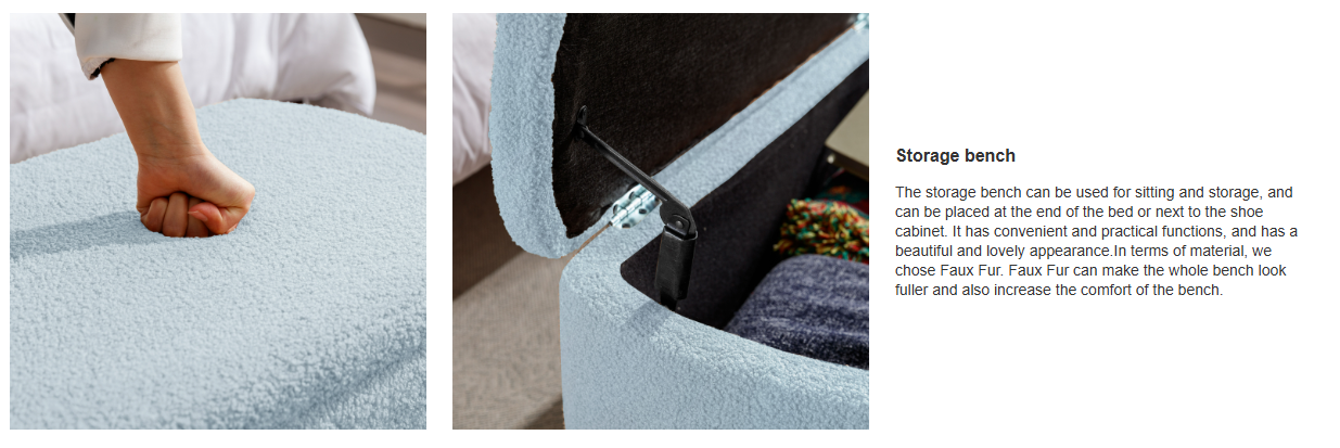 Product Name:Blue Storage Ottoman Bench for End of Bed Gold Legs, Modern Grey Faux Fur Entryway Bench Upholstered Padded with Storage for Living Room Bedroom