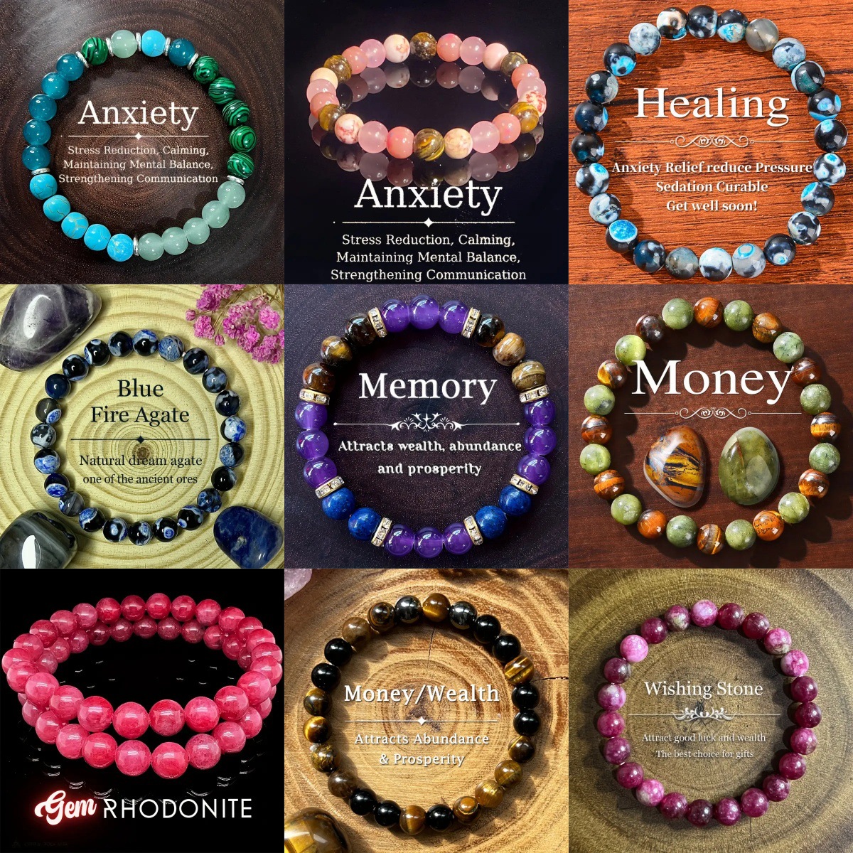 Colors: 1, Stone 2, Stone 3, 4, 5, 6, 7, 8, 9, 10, 11, Stone 12, Stone 13, Stone 14, Stone 15, Stone 16, 17, Stone 18, 19, Glass 2, Glass 3, Glass 12, Glass Tiger’s Eye 13, Glass 14, Glass 15, Glass 16, Glass 18