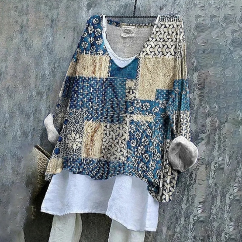 Blue Floral Patchwork Japanese Art Linen Blend Tunic