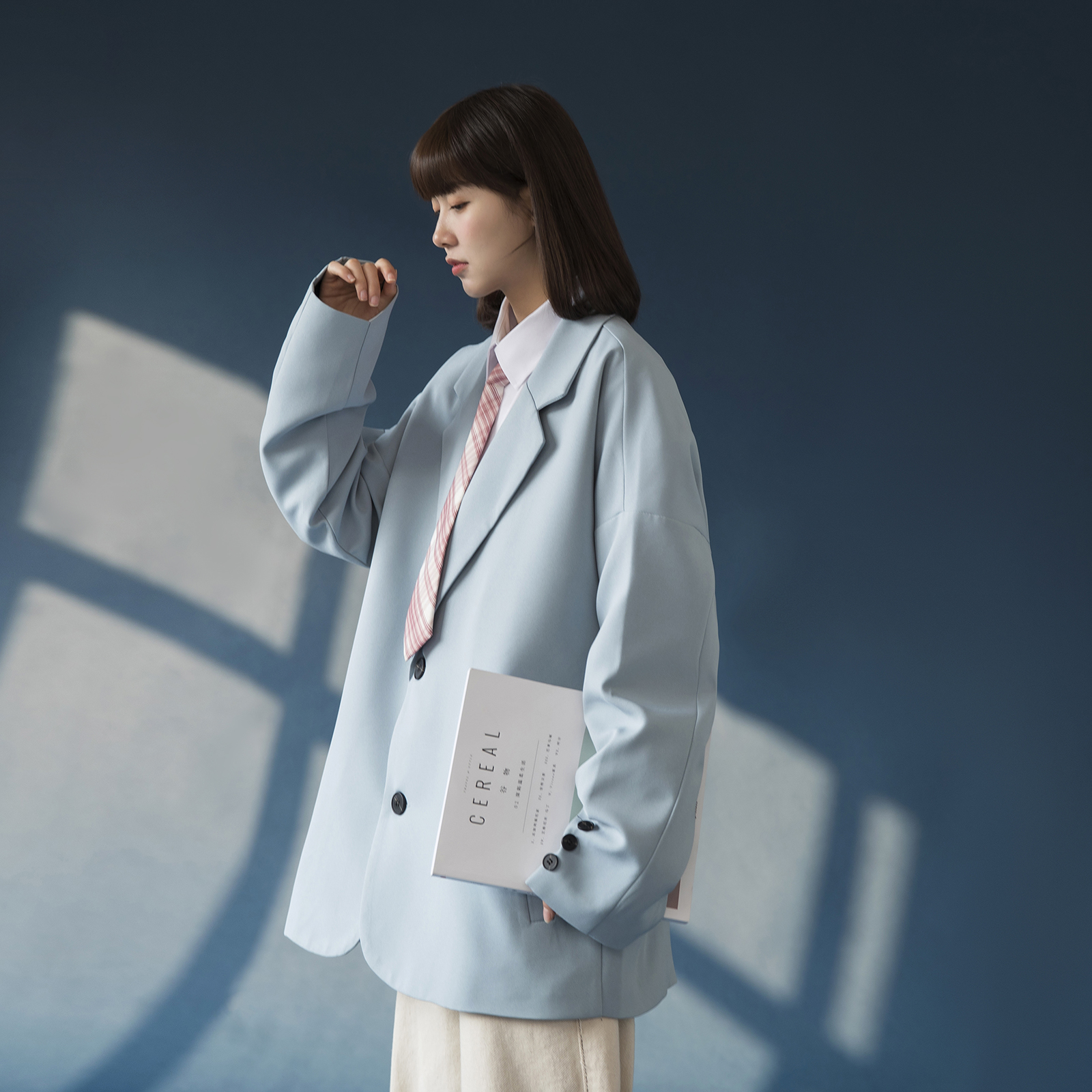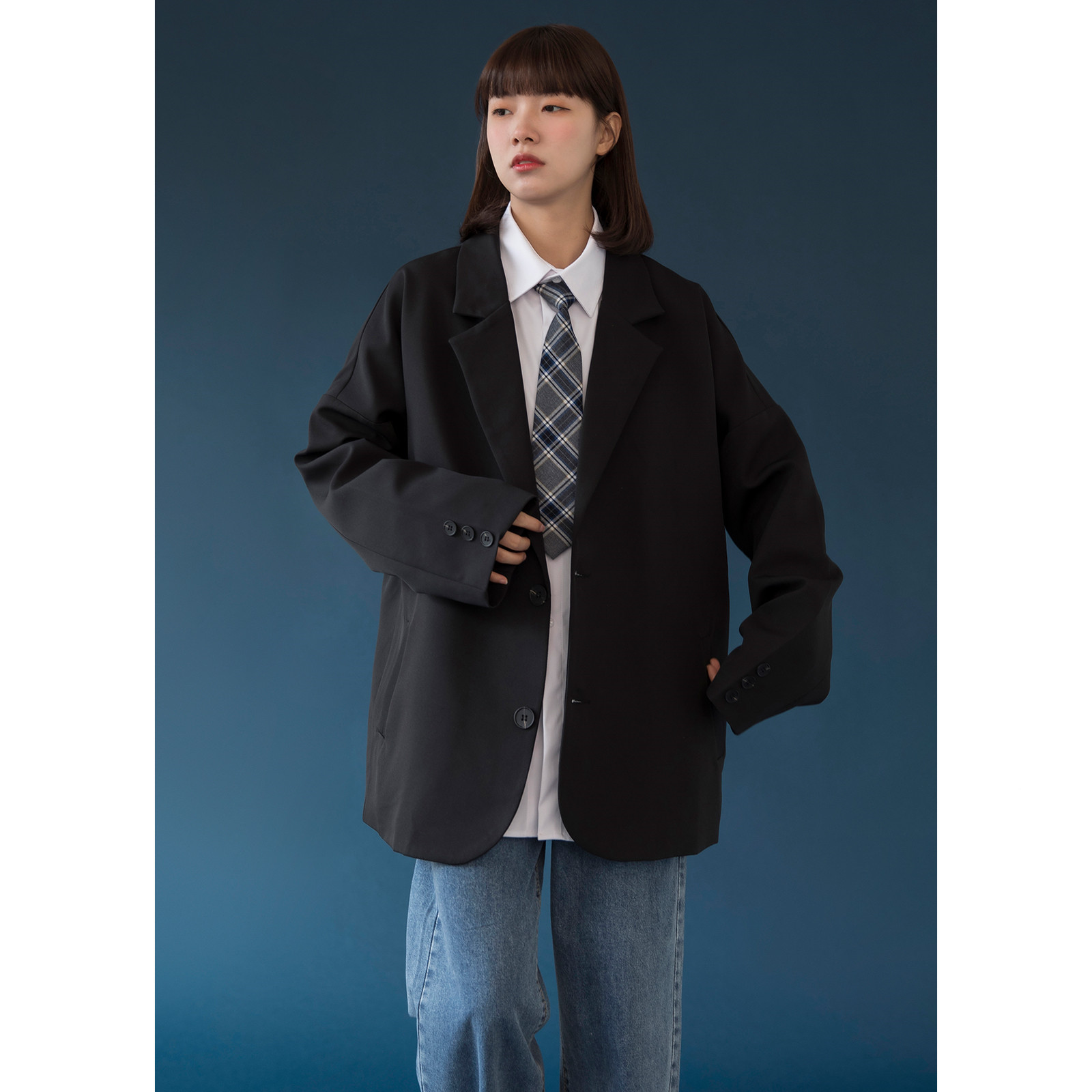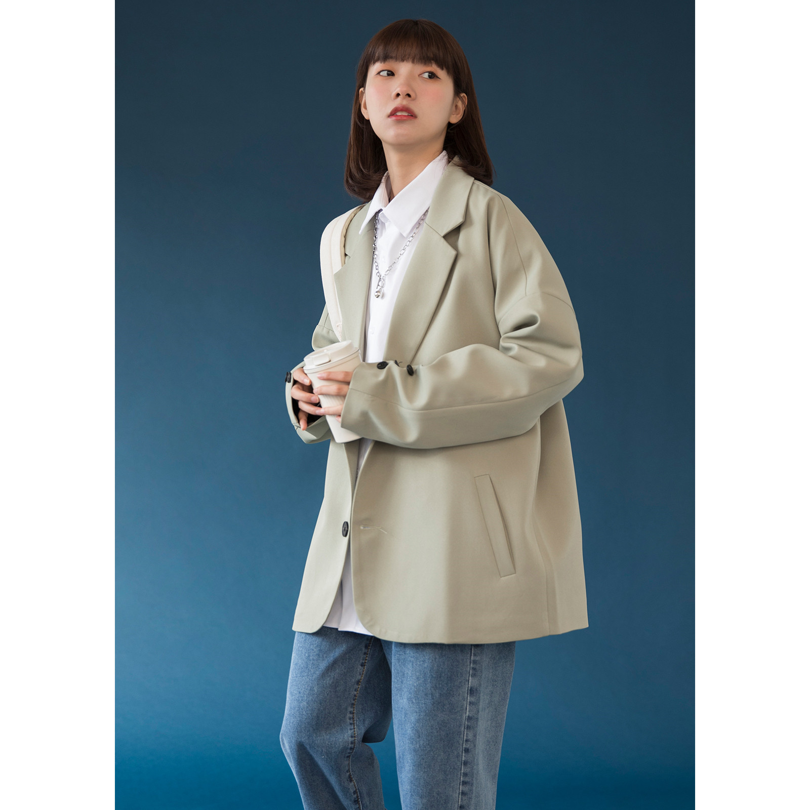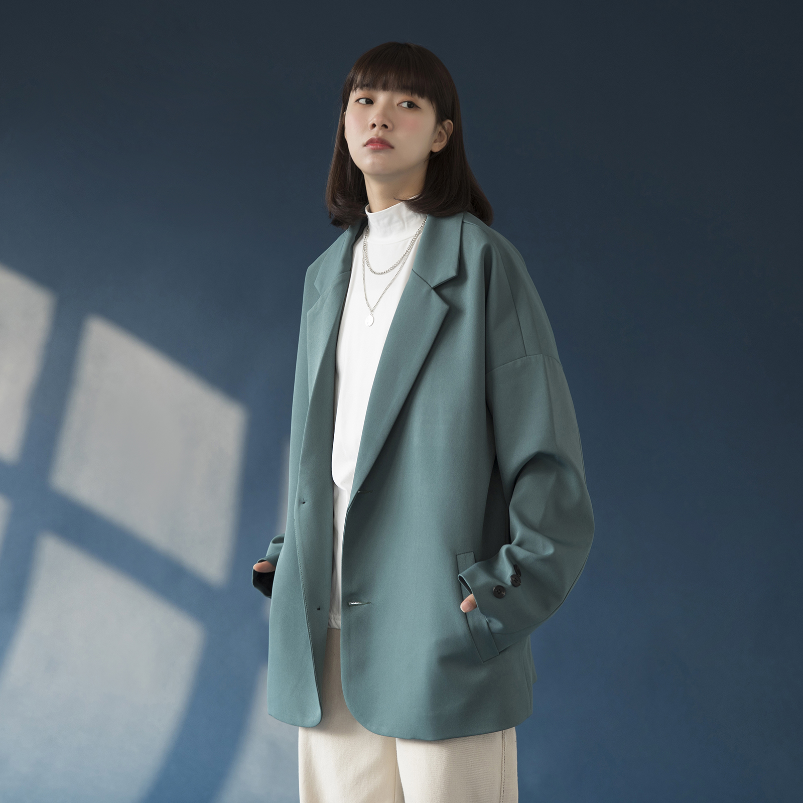 Features: single-breasted, semi-open collar