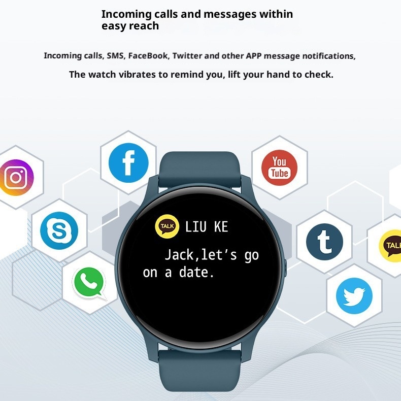 Functions: step counting, heart rate monitoring, blood pressure measurement, social entertainment, Bluetooth calling, smart reminder, remote control selfie, sleep monitoring, blood oxygen detection