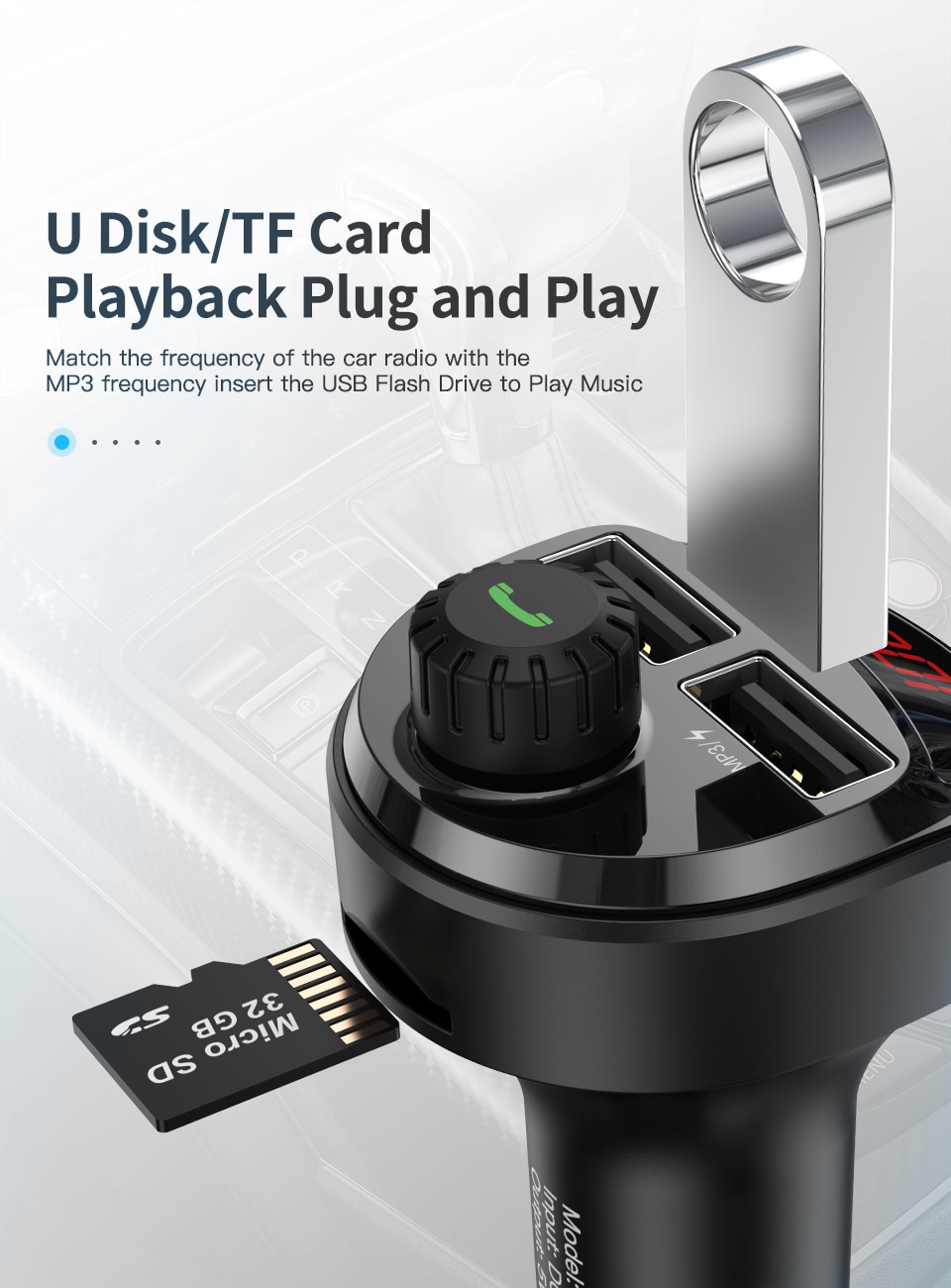 Interface: USB1 (rechargeable, can insert U disk to play music), USB2 (fast charge), TF memory card slot