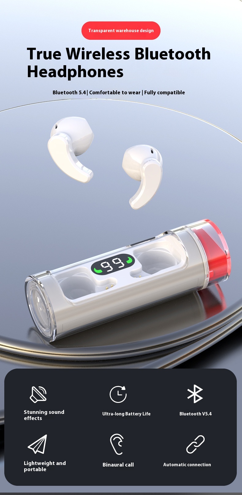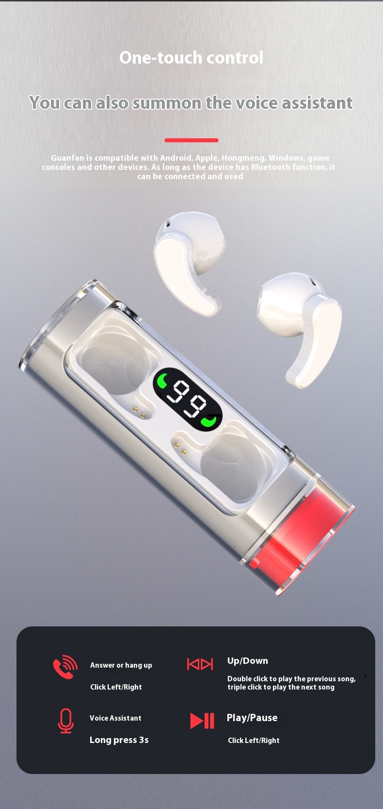 Functions: Waterproof, breathing light, super long service life battery, call function, voice control, support music, digital display, e-sports low latency