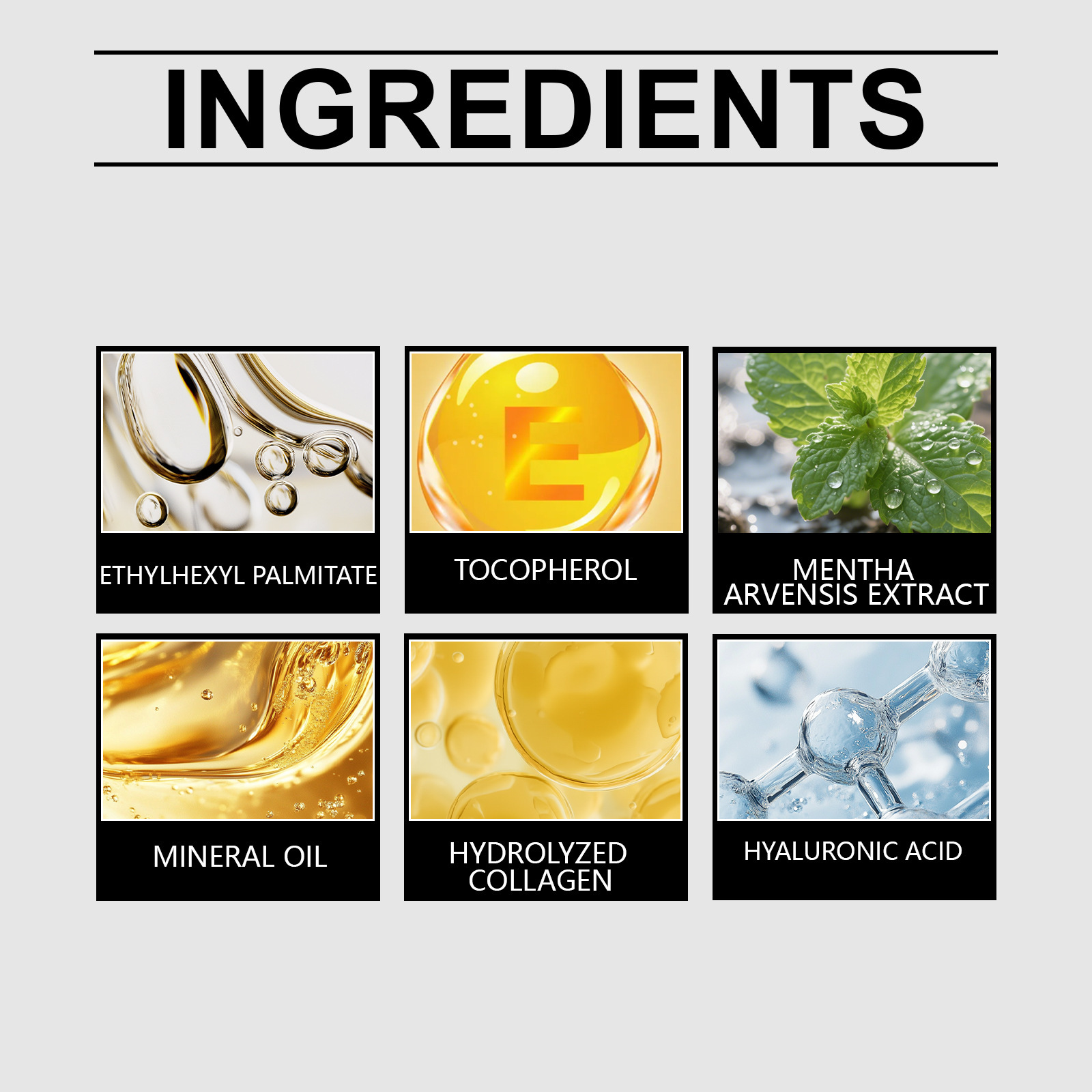 Active ingredients: tocopherol (vitamin E), mint extract, hydrolyzed collagen, hyaluronic acid.