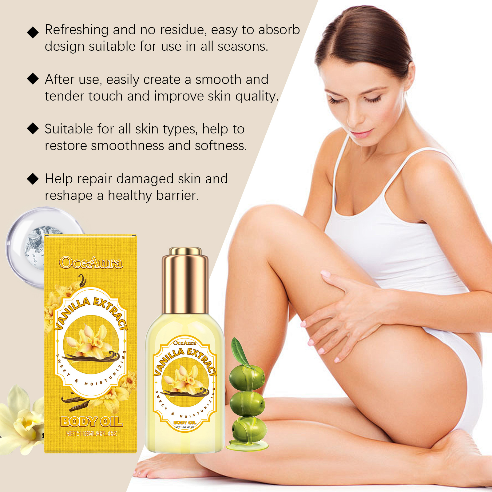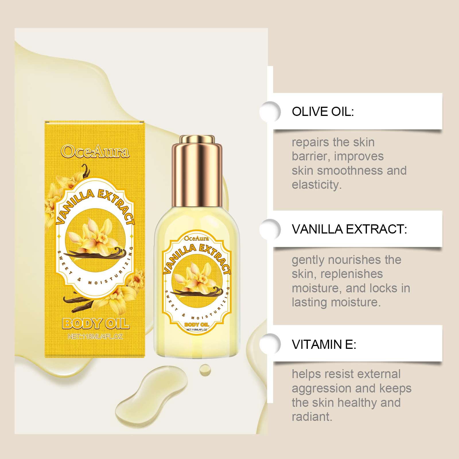 Ingredients: mineral oil, vanilla extract, olive oil, hyaluronic acid, vitamin E (tocopherol)
