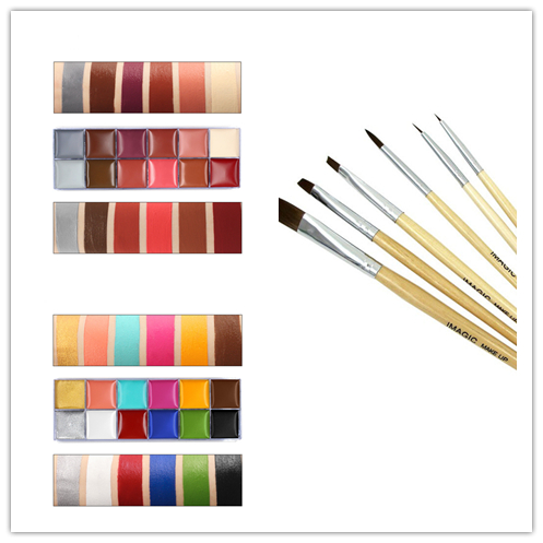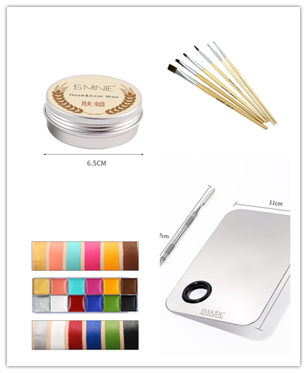 Set: contains a box of 12 color paints, six brushes, a palette, and a box of skin wax