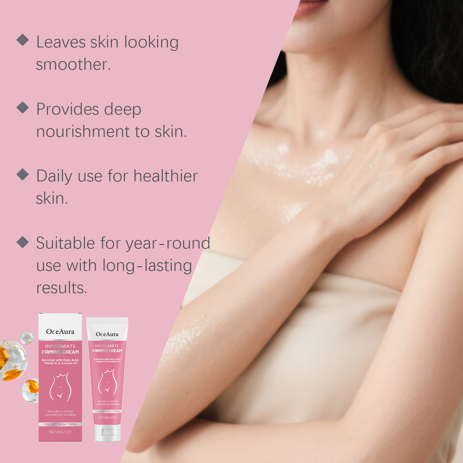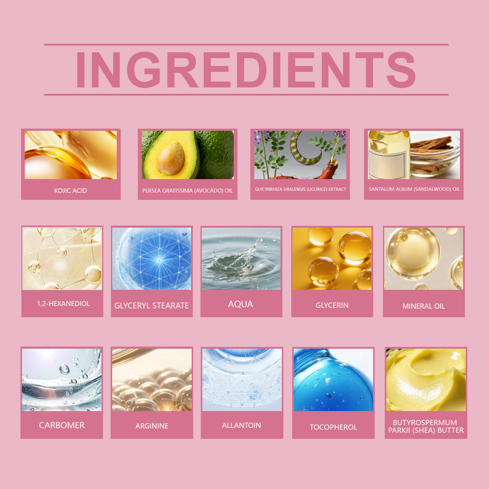 Ingredients: water, mineral oil, glycerin, glycerol stearate, 1,2-hexanediol, carbomer, arginine, allantoin, tocopherol (vitamin E), shea butter, kojic acid, avocado oil, licorice extract, sandalwood oil.