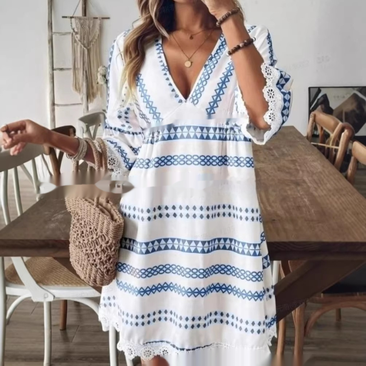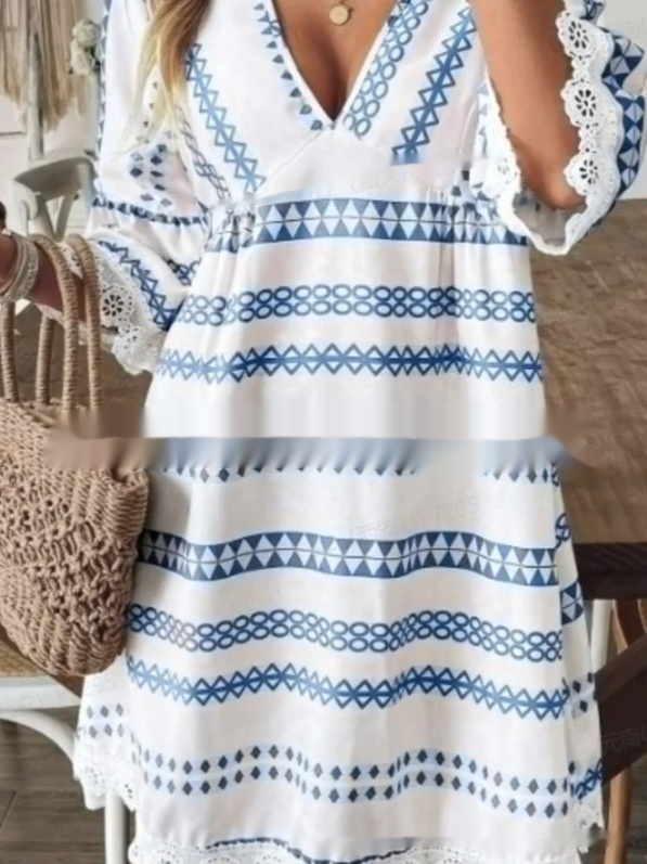 Bohemian Striped V-Neck Lace-trimmed Cuffs Dress For Women