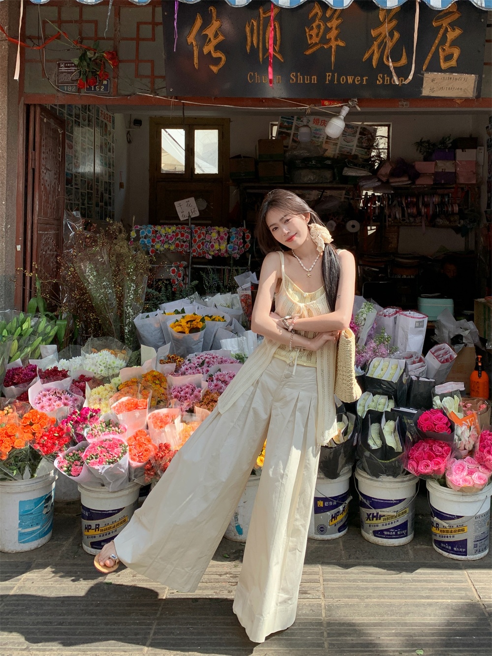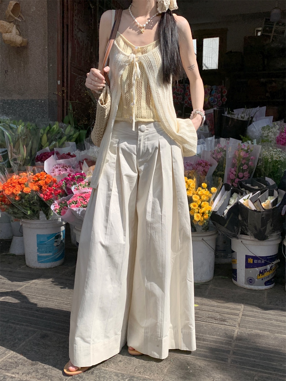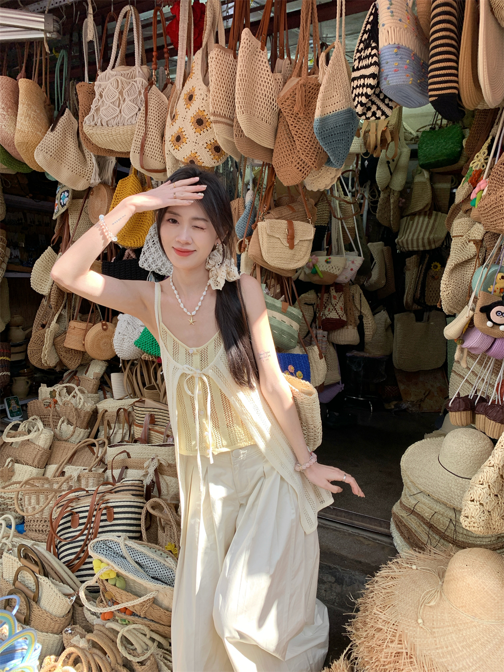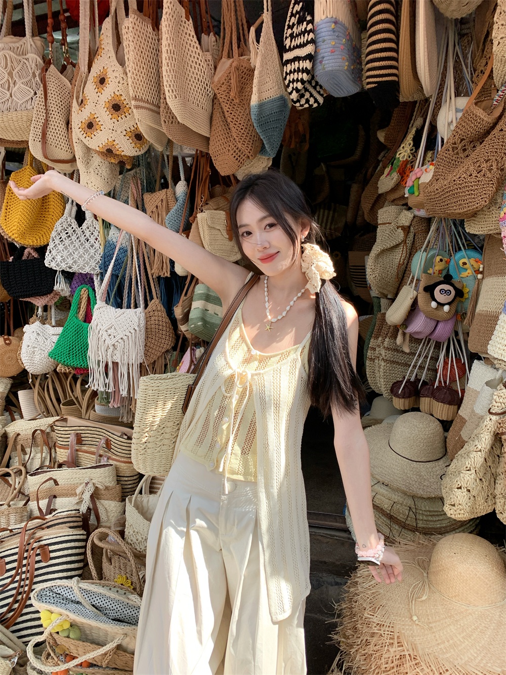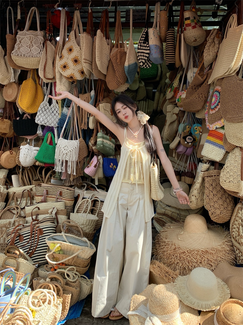 Color: cream yellow suspenders, pants
