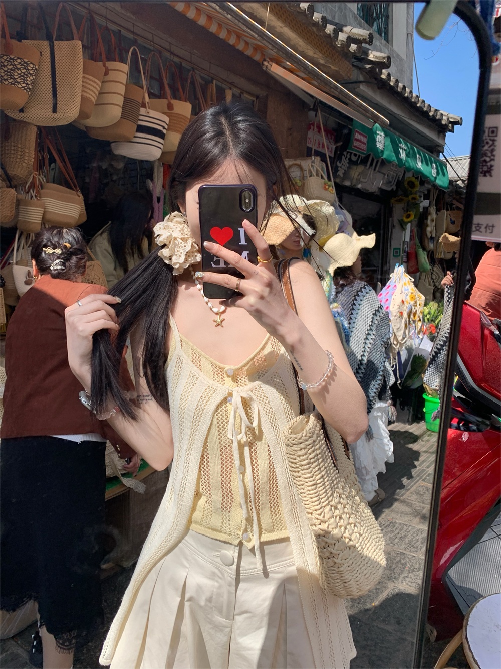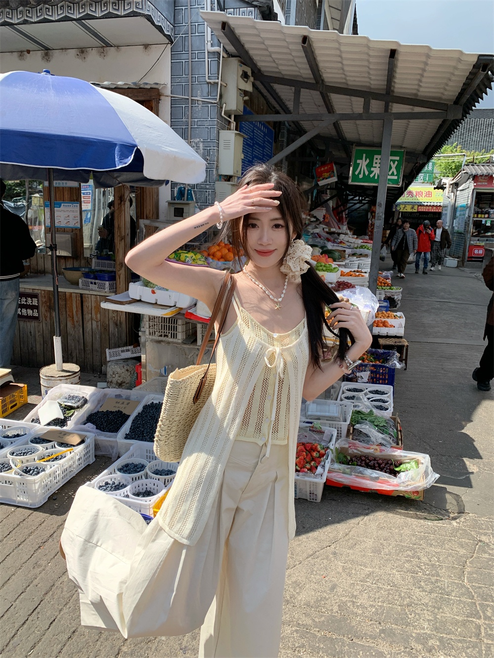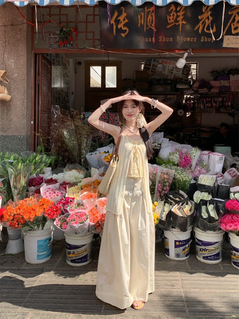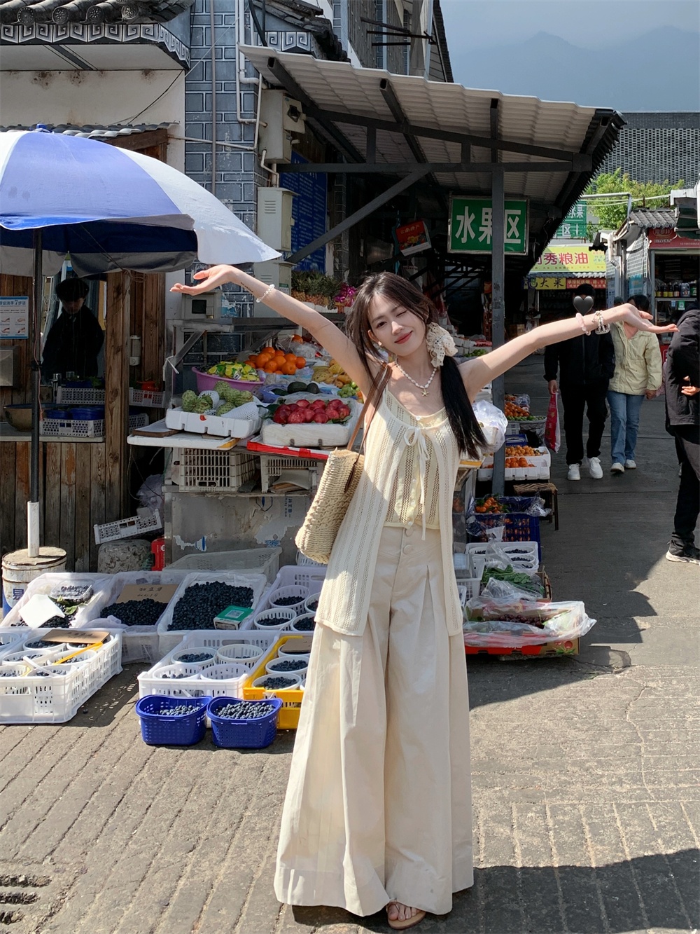 Color: cream yellow suspenders, pants