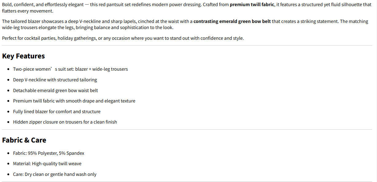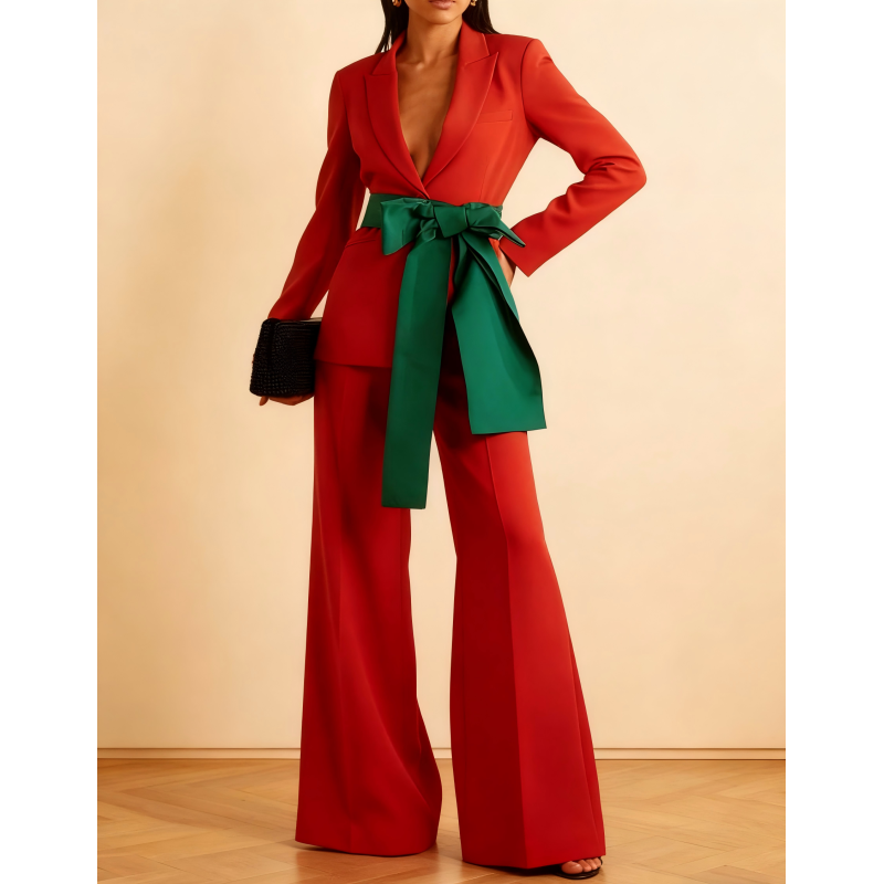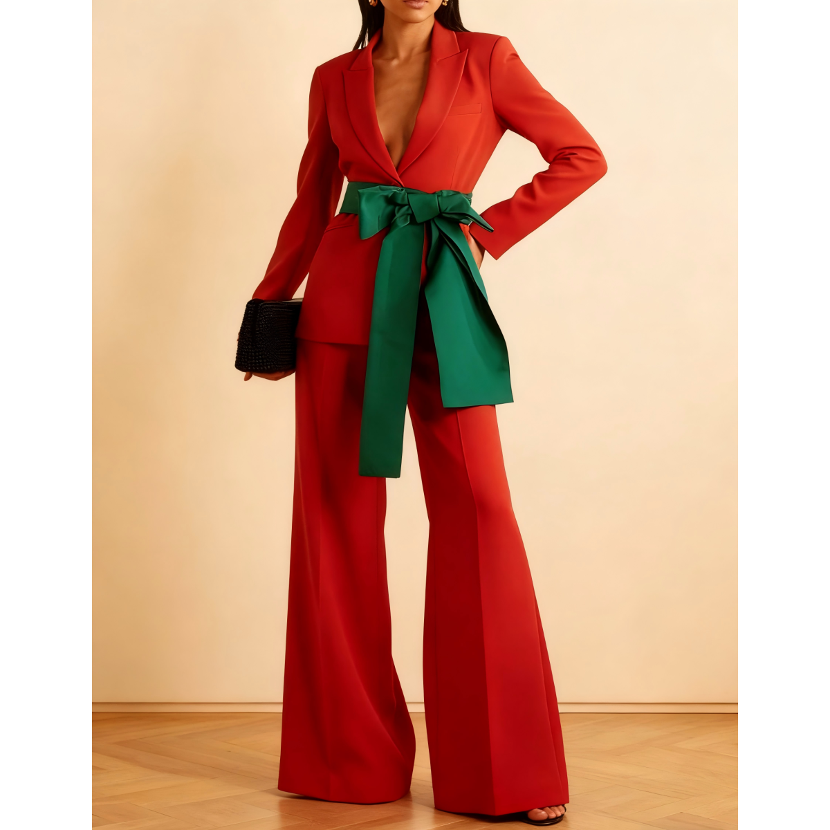 Bold Scarlet Tailored Pantsuit With Emerald Waist Bow